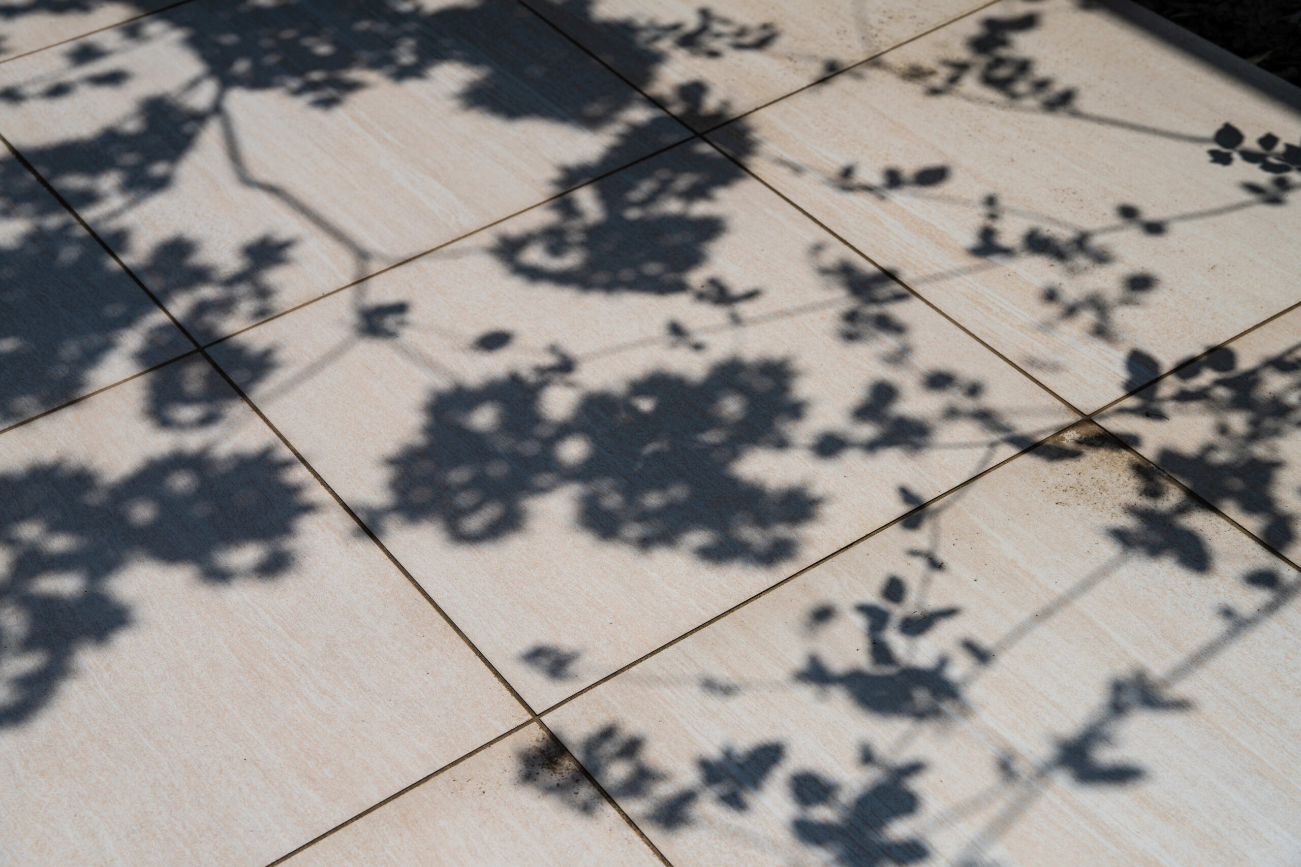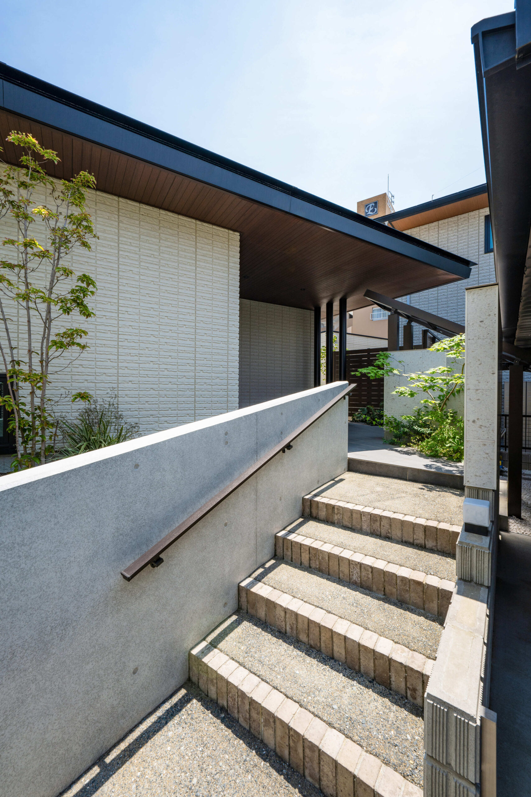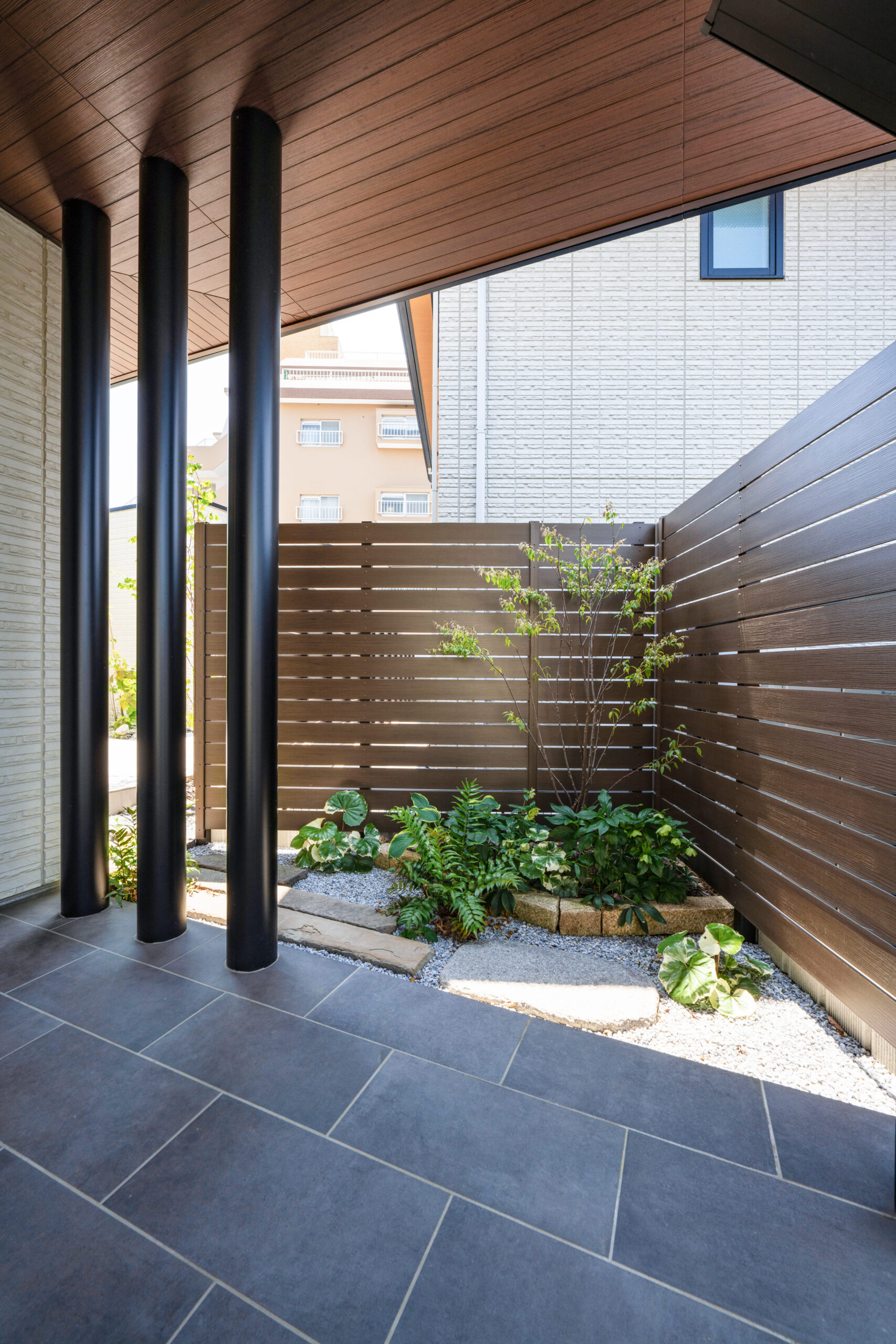 ガレージをタイル張りで施工し、メインである門柱をアルミ材を使い繋げることで一体感を出しました。全体的にポイント施工を無くし、アプローチはスロープを用いて空間を長くとり、植栽を多く取り入れました。中庭は各部屋から外を見た時に楽しんでもらえる外構に。