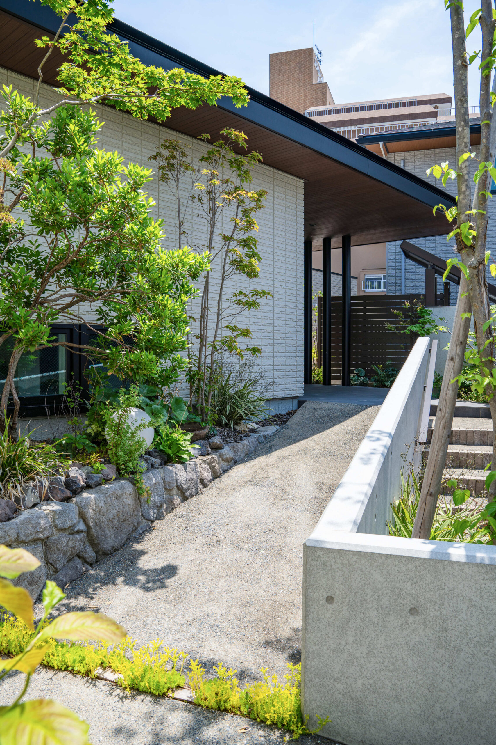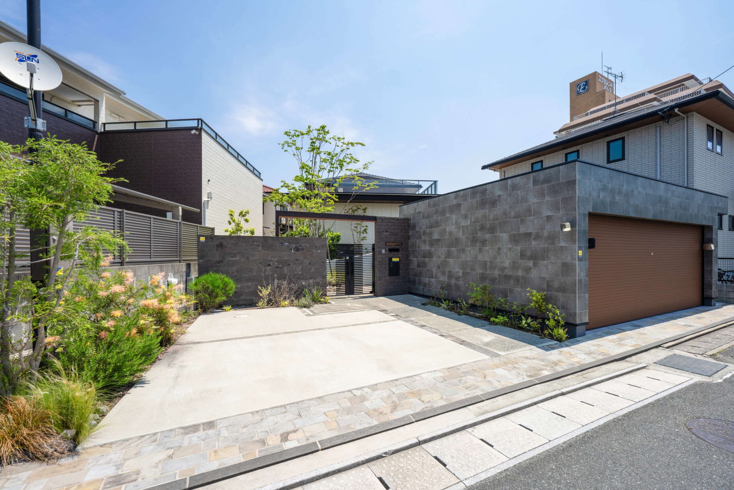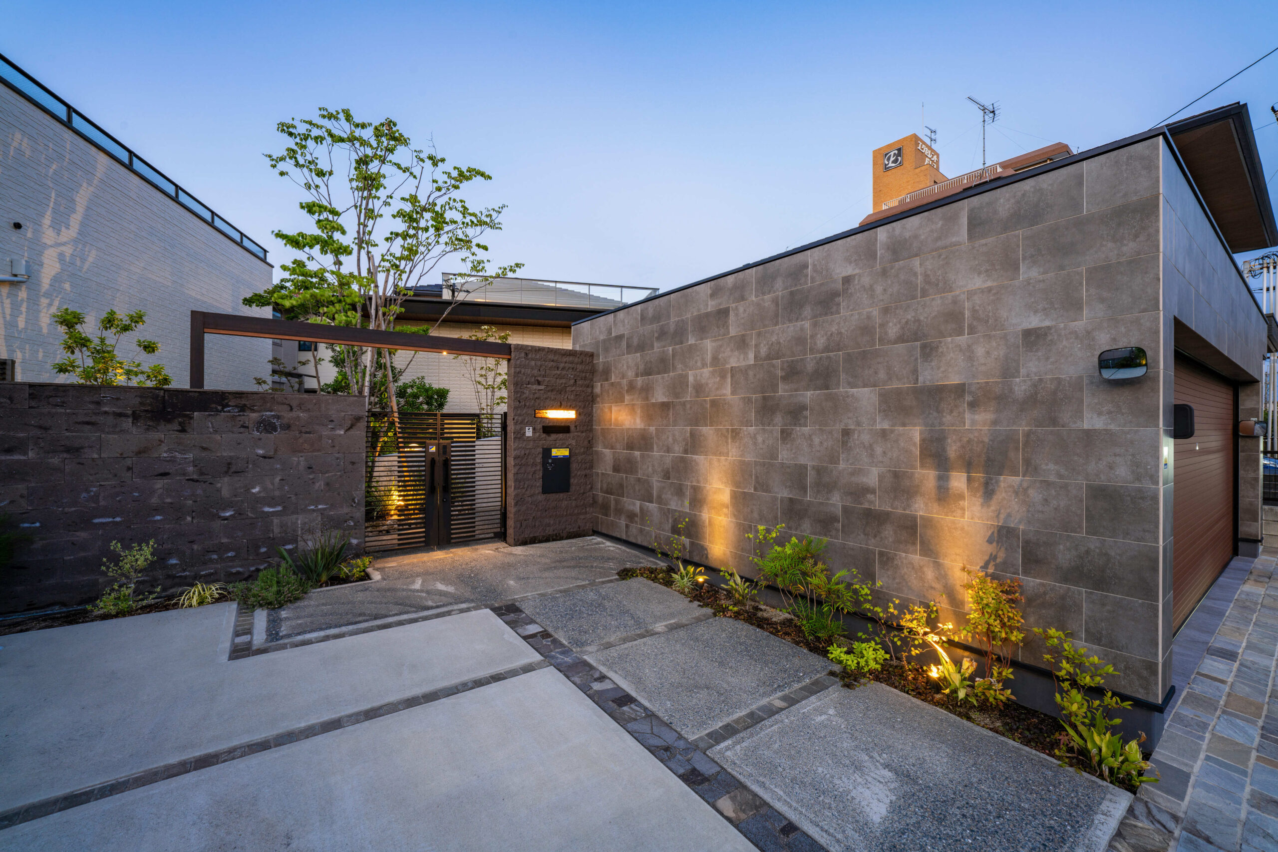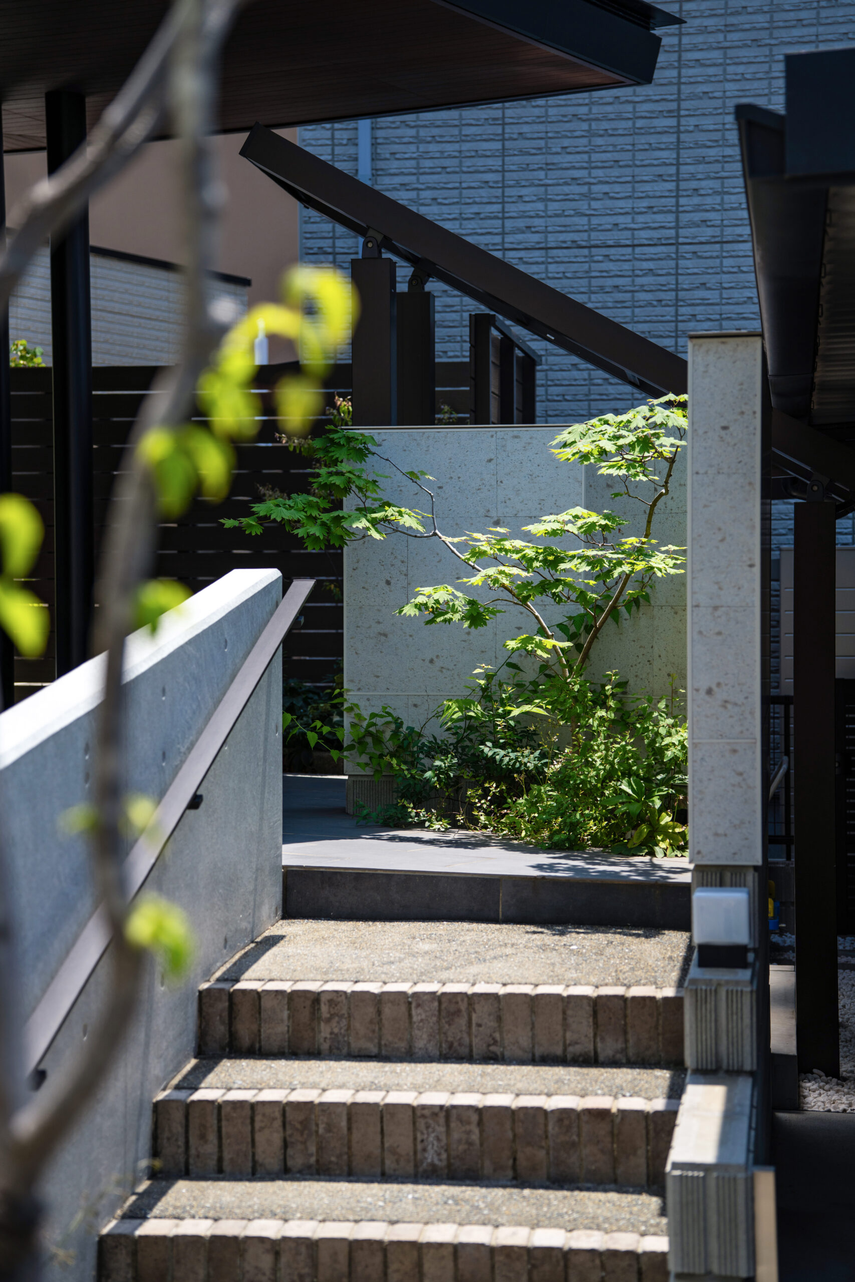 ガレージをタイル張りで施工し、メインである門柱をアルミ材を使い繋げることで一体感を出しました。全体的にポイント施工を無くし、アプローチはスロープを用いて空間を長くとり、植栽を多く取り入れました。中庭は各部屋から外を見た時に楽しんでもらえる外構に。