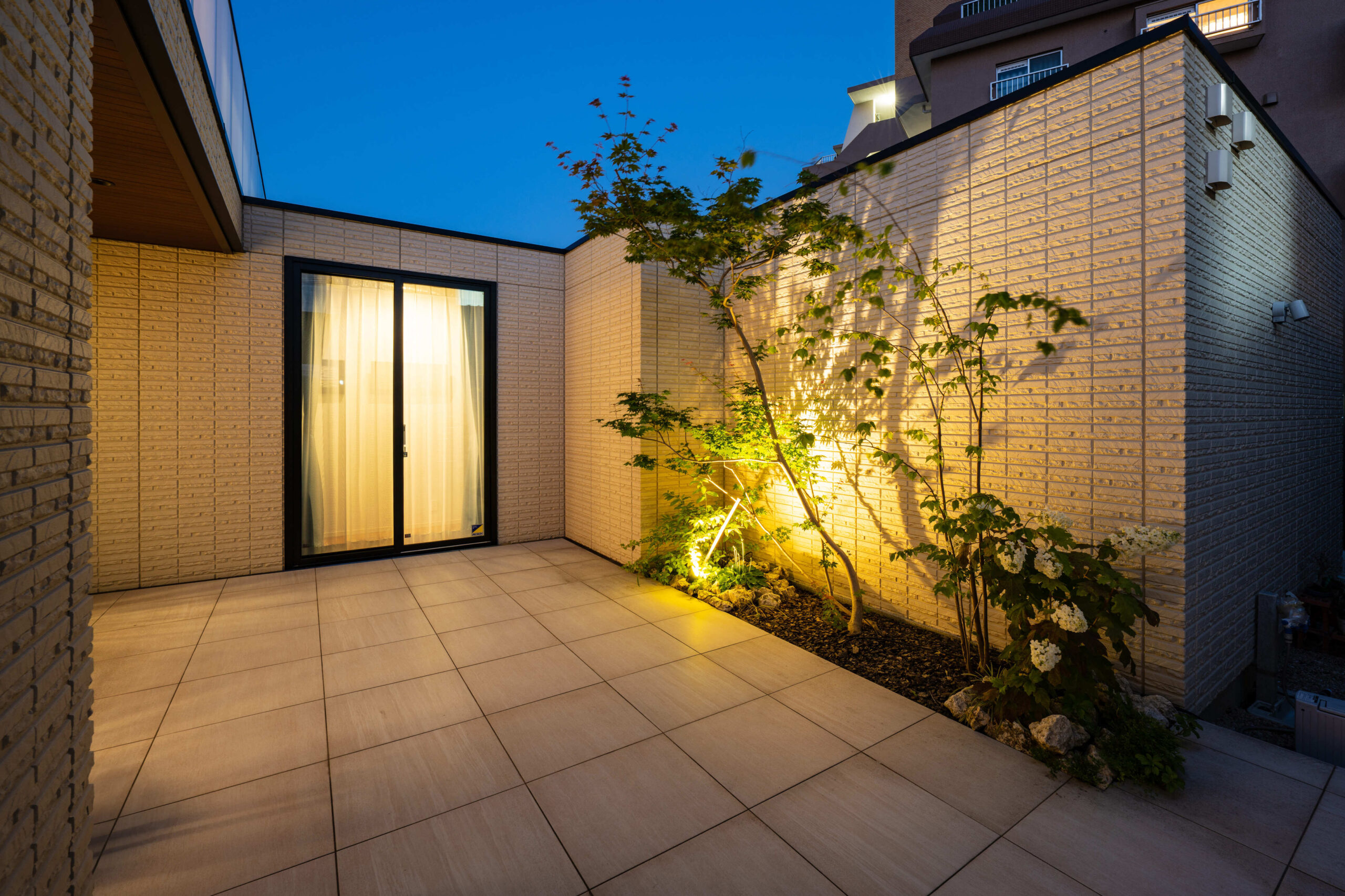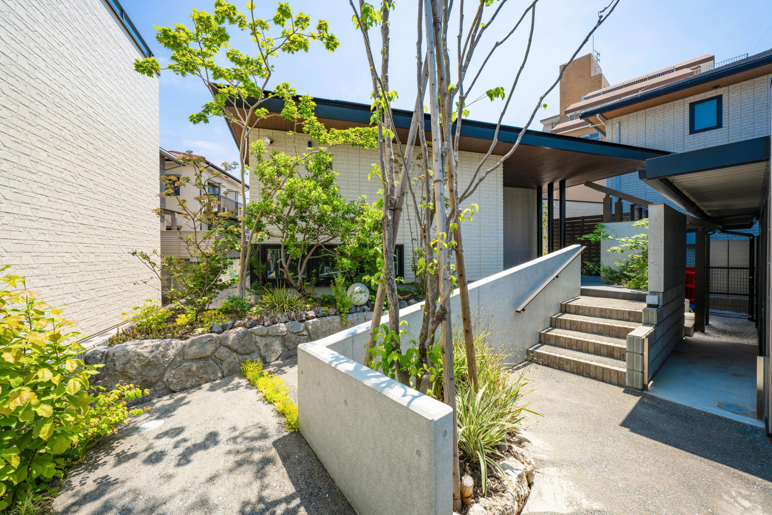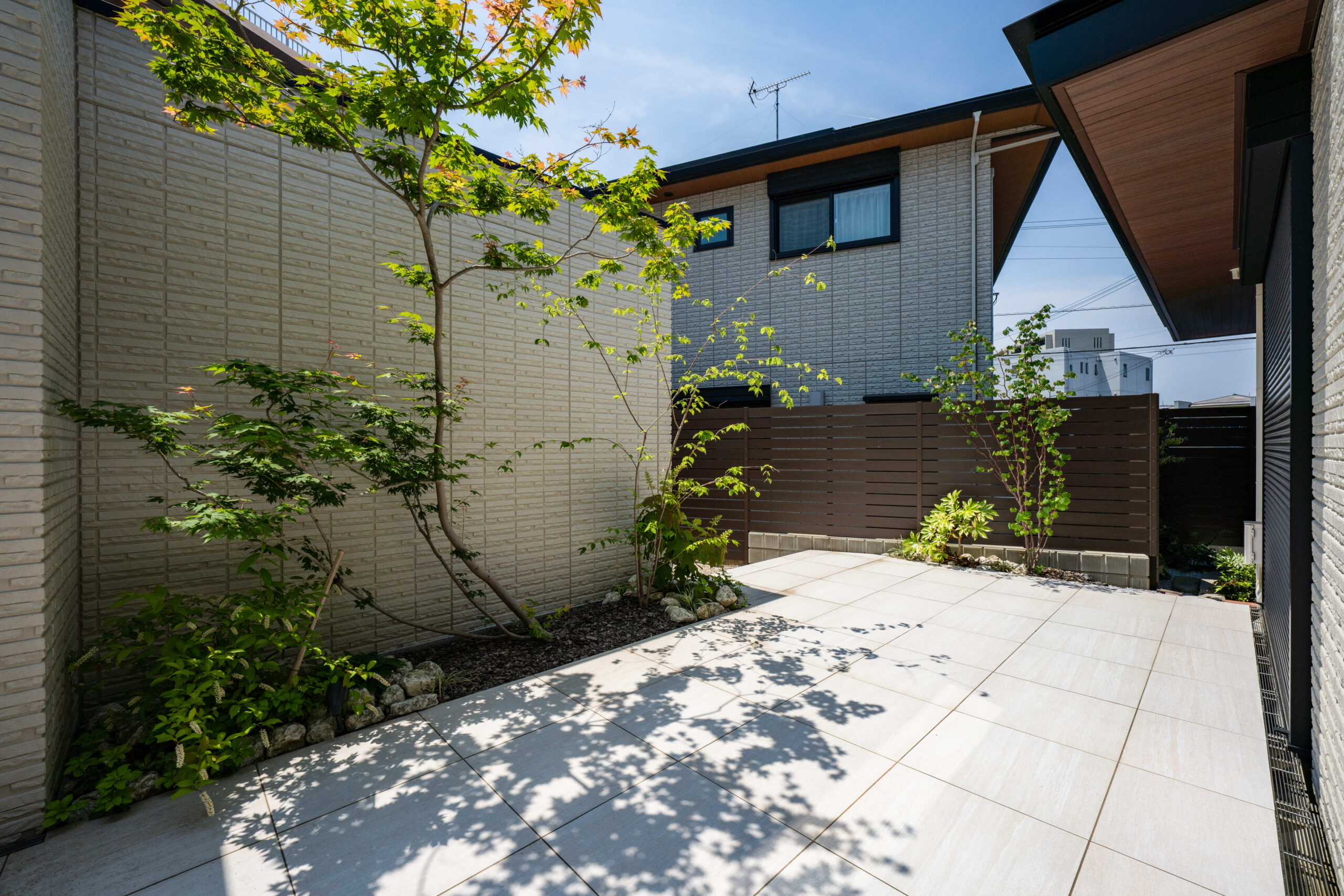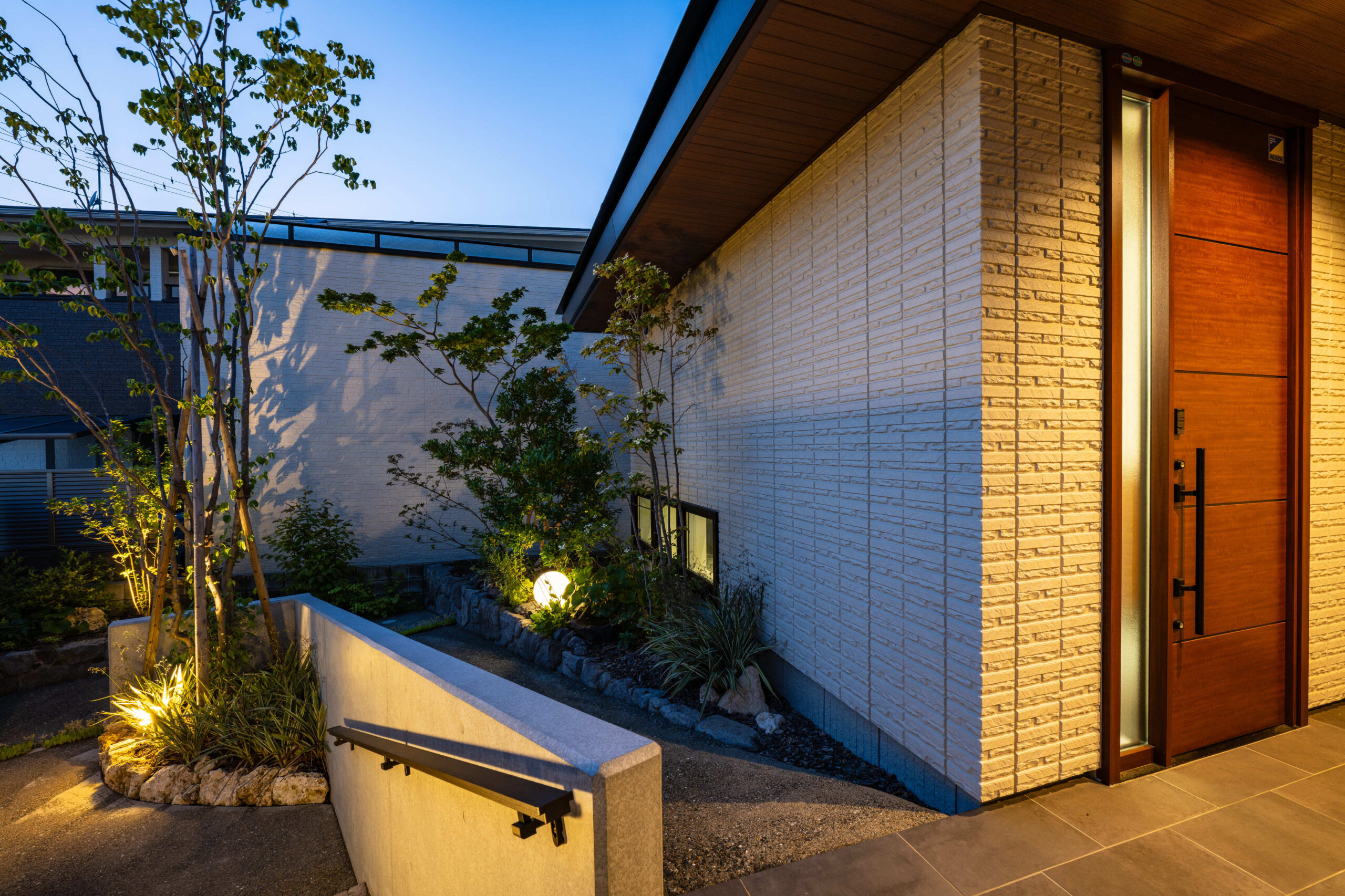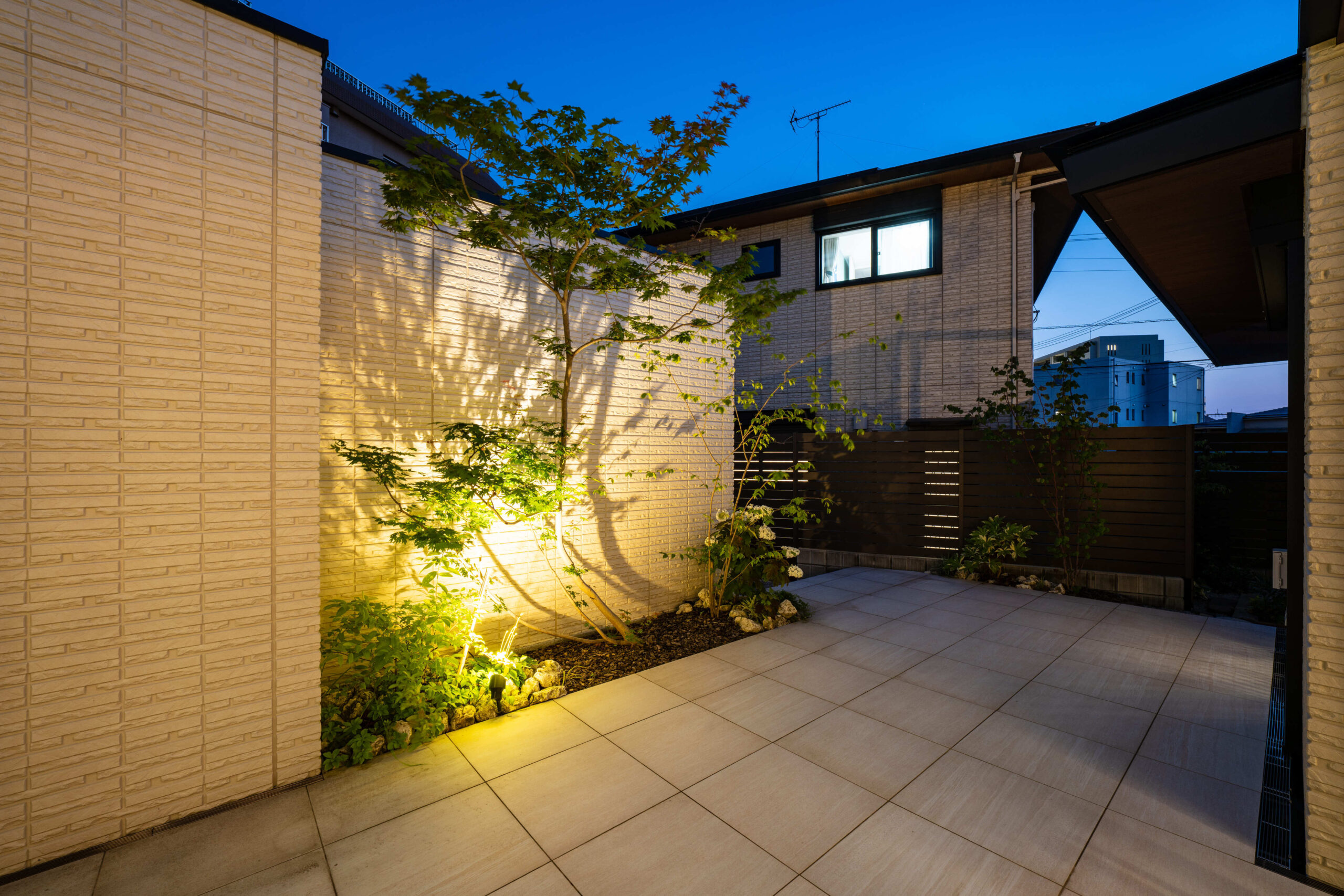 ガレージをタイル張りで施工し、メインである門柱をアルミ材を使い繋げることで一体感を出しました。全体的にポイント施工を無くし、アプローチはスロープを用いて空間を長くとり、植栽を多く取り入れました。中庭は各部屋から外を見た時に楽しんでもらえる外構に。