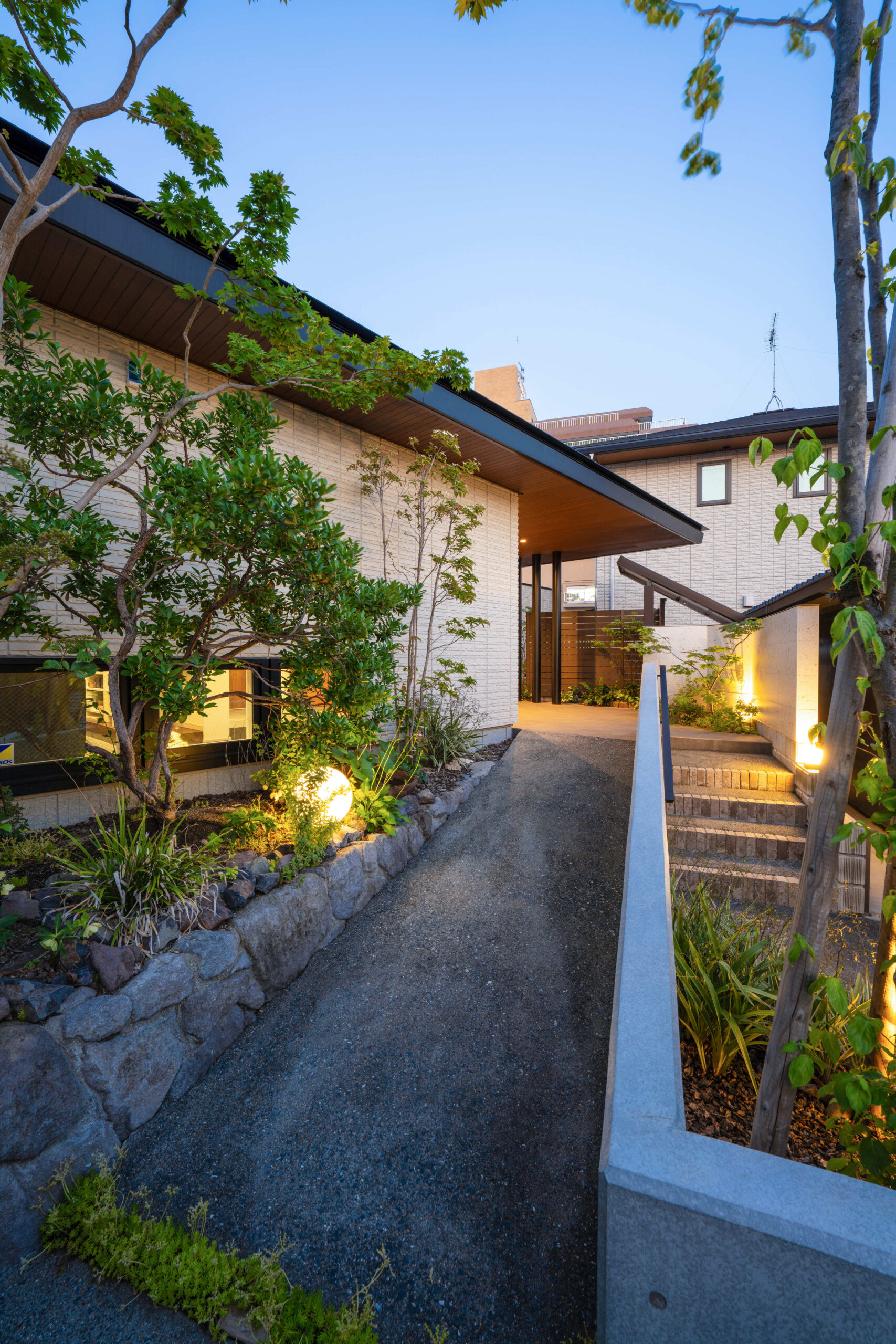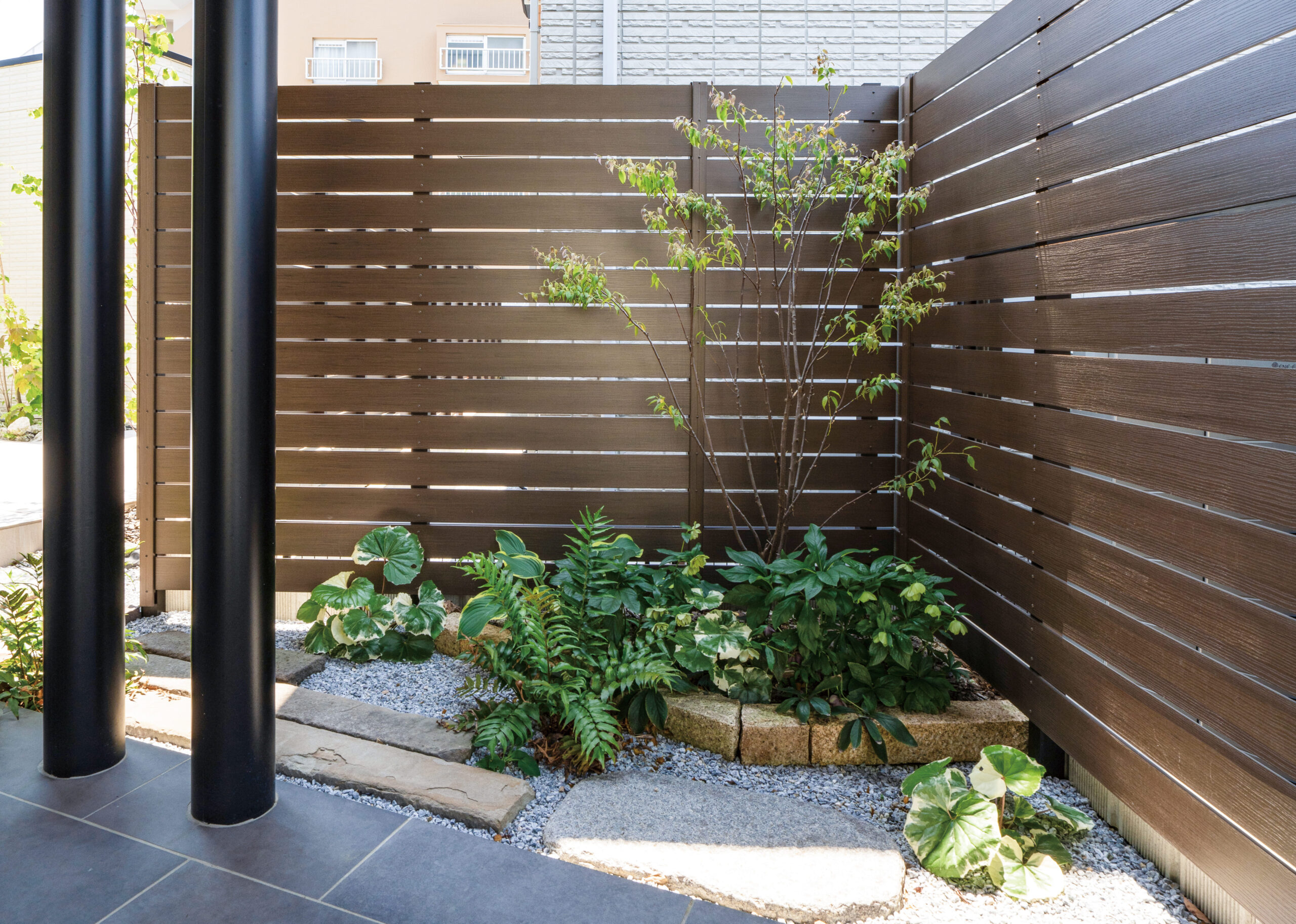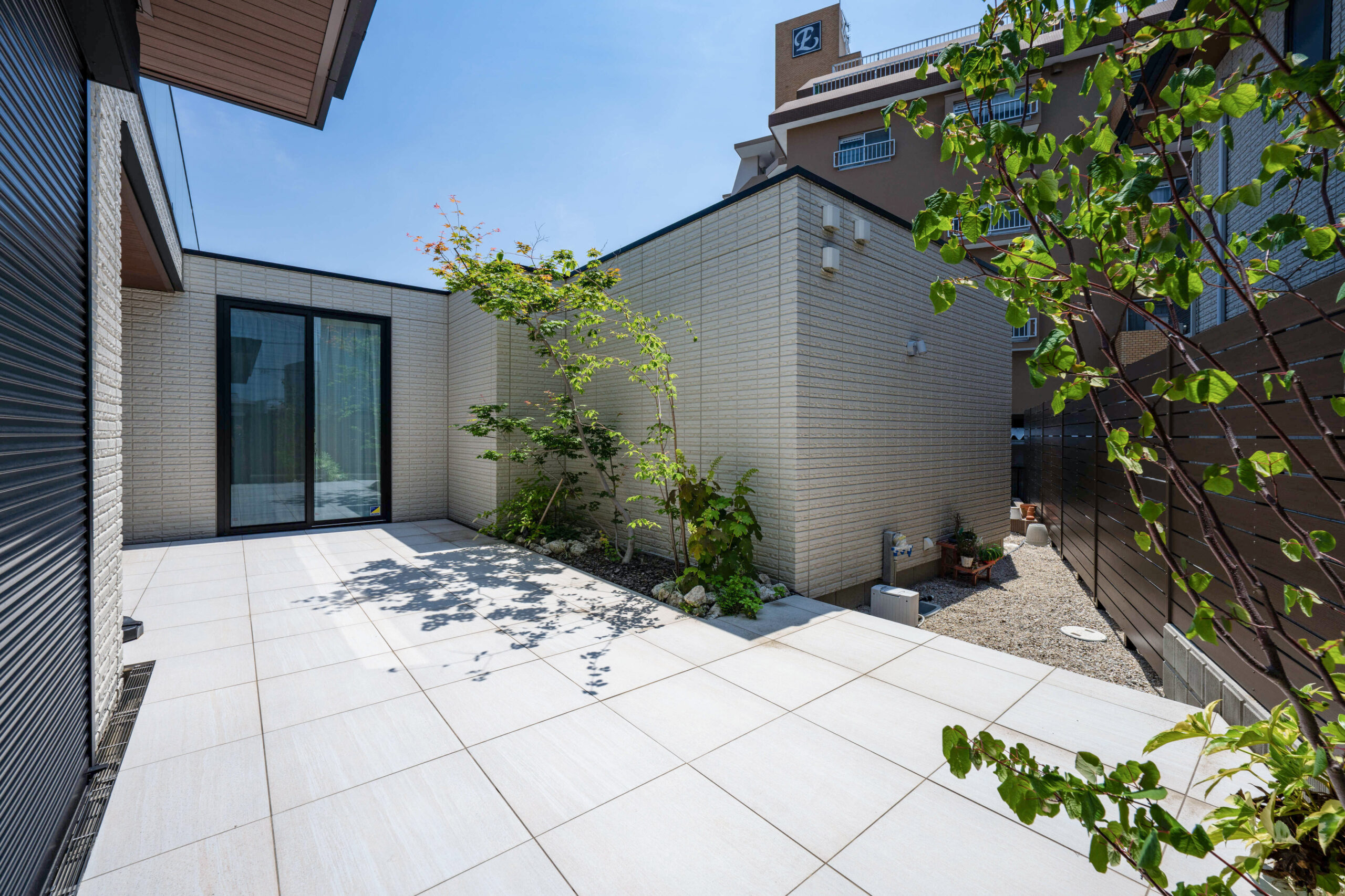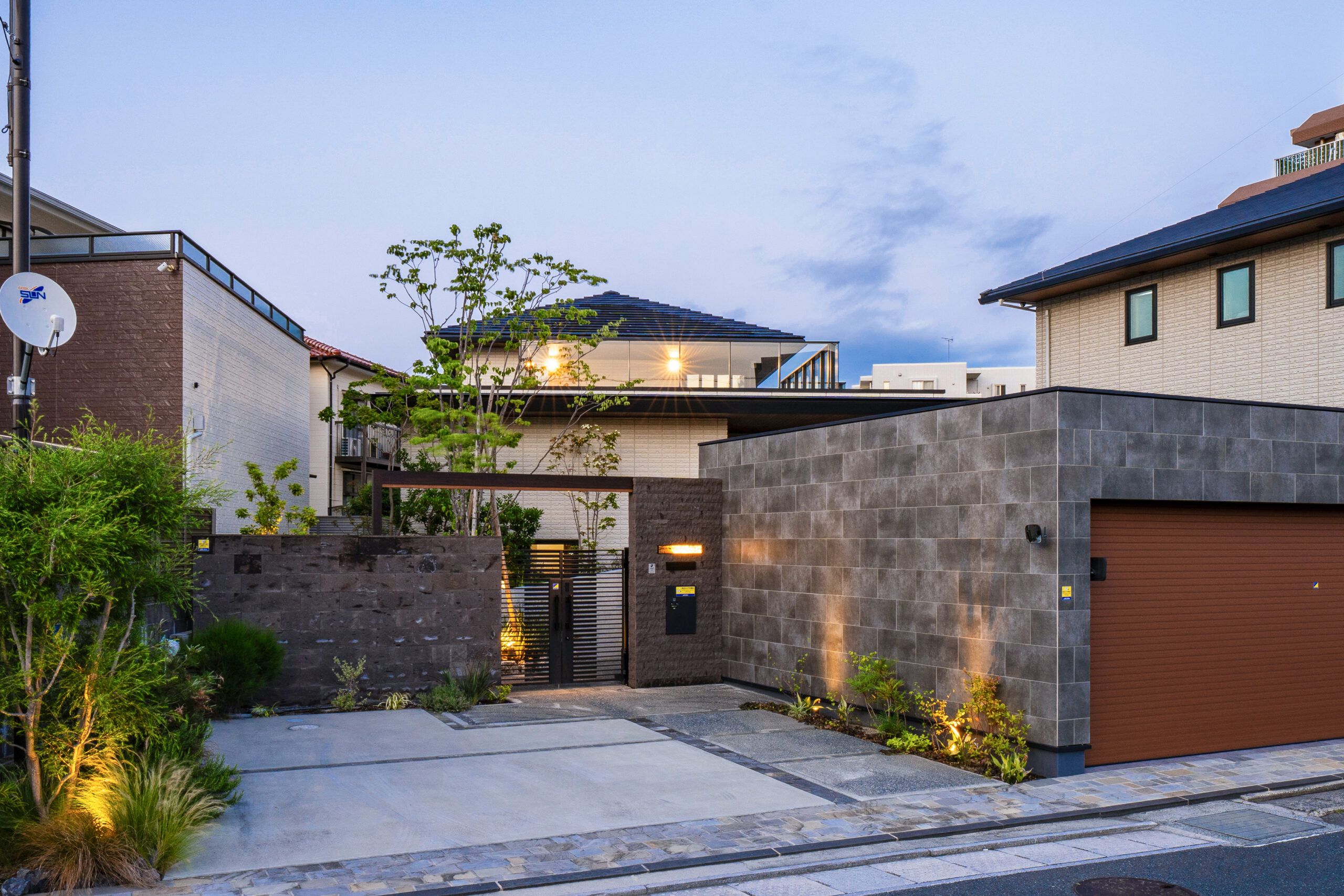 ガレージをタイル張りで施工し、メインである門柱をアルミ材を使い繋げることで一体感を出しました。全体的にポイント施工を無くし、アプローチはスロープを用いて空間を長くとり、植栽を多く取り入れました。中庭は各部屋から外を見た時に楽しんでもらえる外構に。