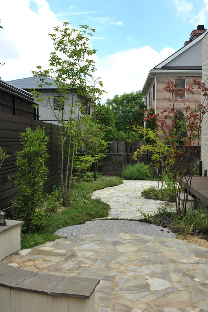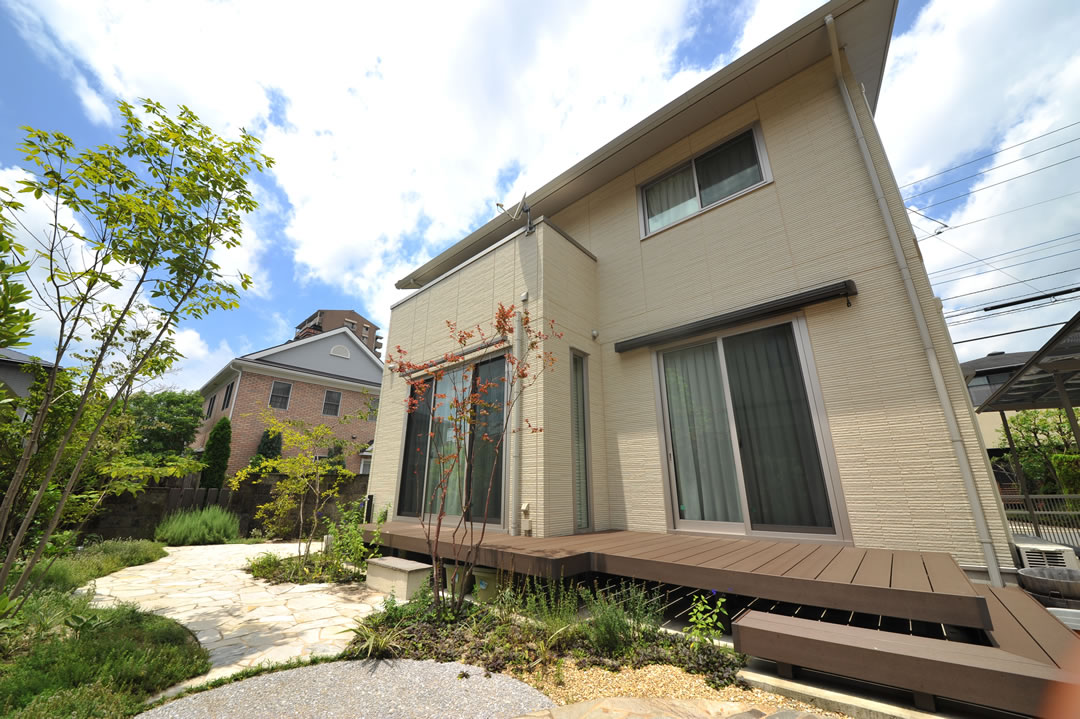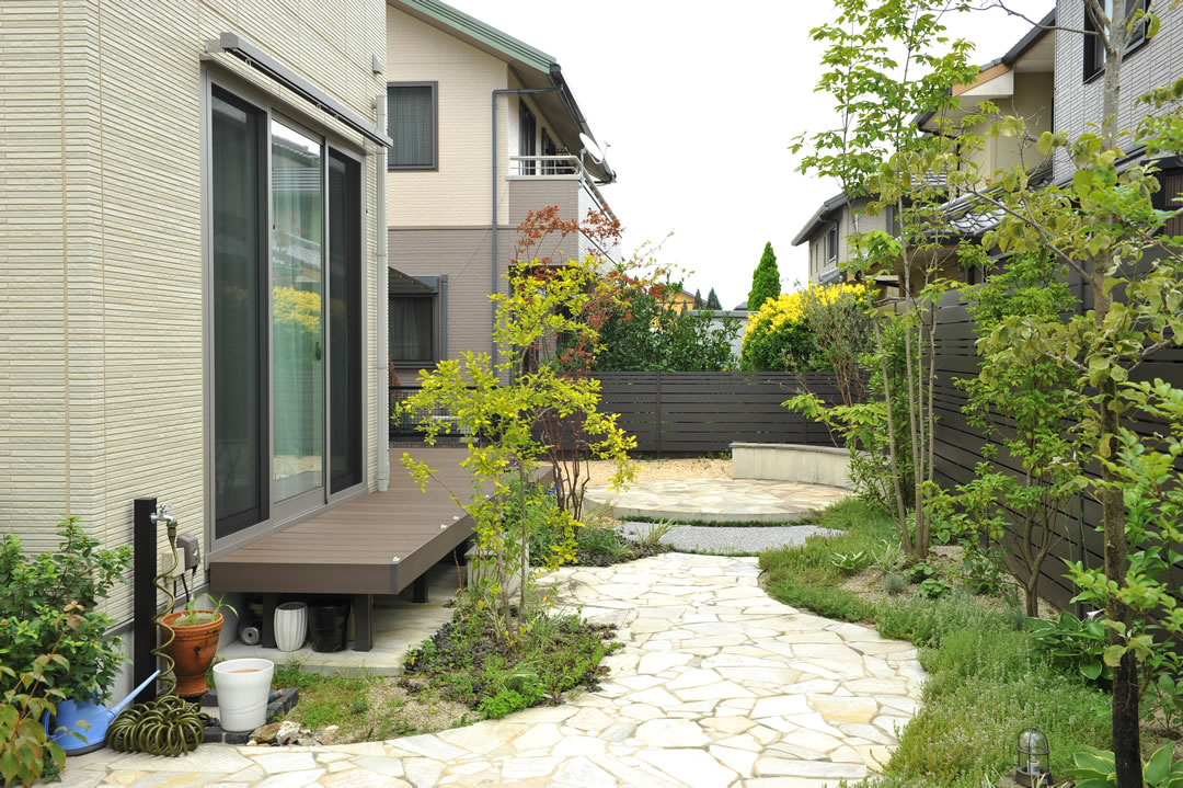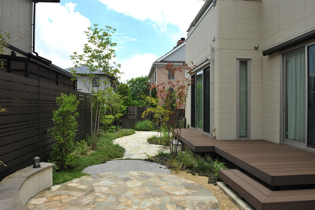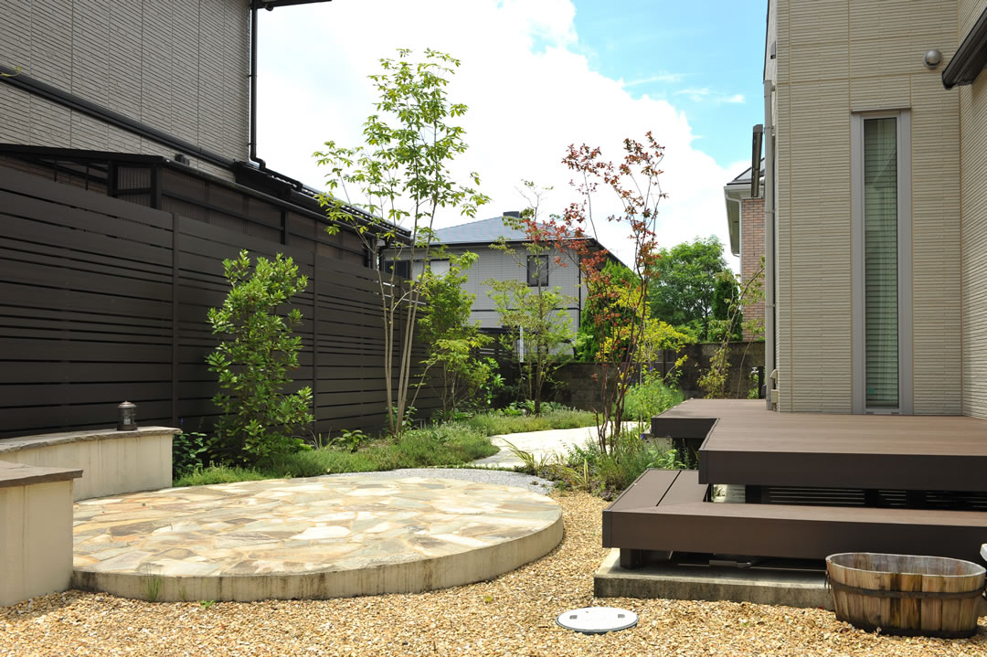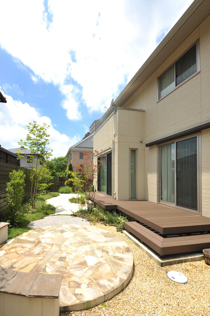『家族団欒を楽しめる庭づくり』をテーマに、デザインから施工まで手がけました。 四季ごとに表情を変える植栽を楽しみながら、夏には家族みんなで花火をしたり。そんな時間を育む庭です。 開放感のあるウッドデッキやタイルテラスが、心地よい空間を造りました。