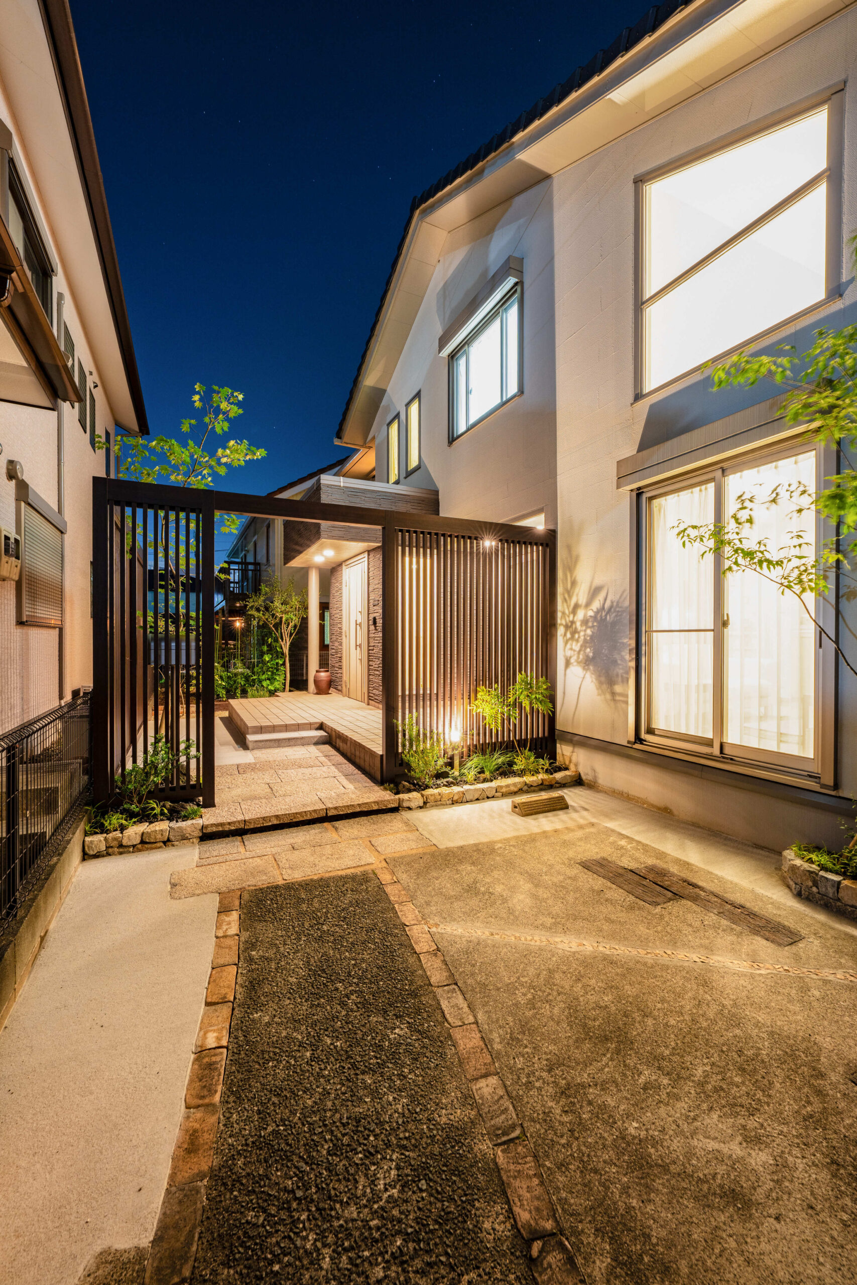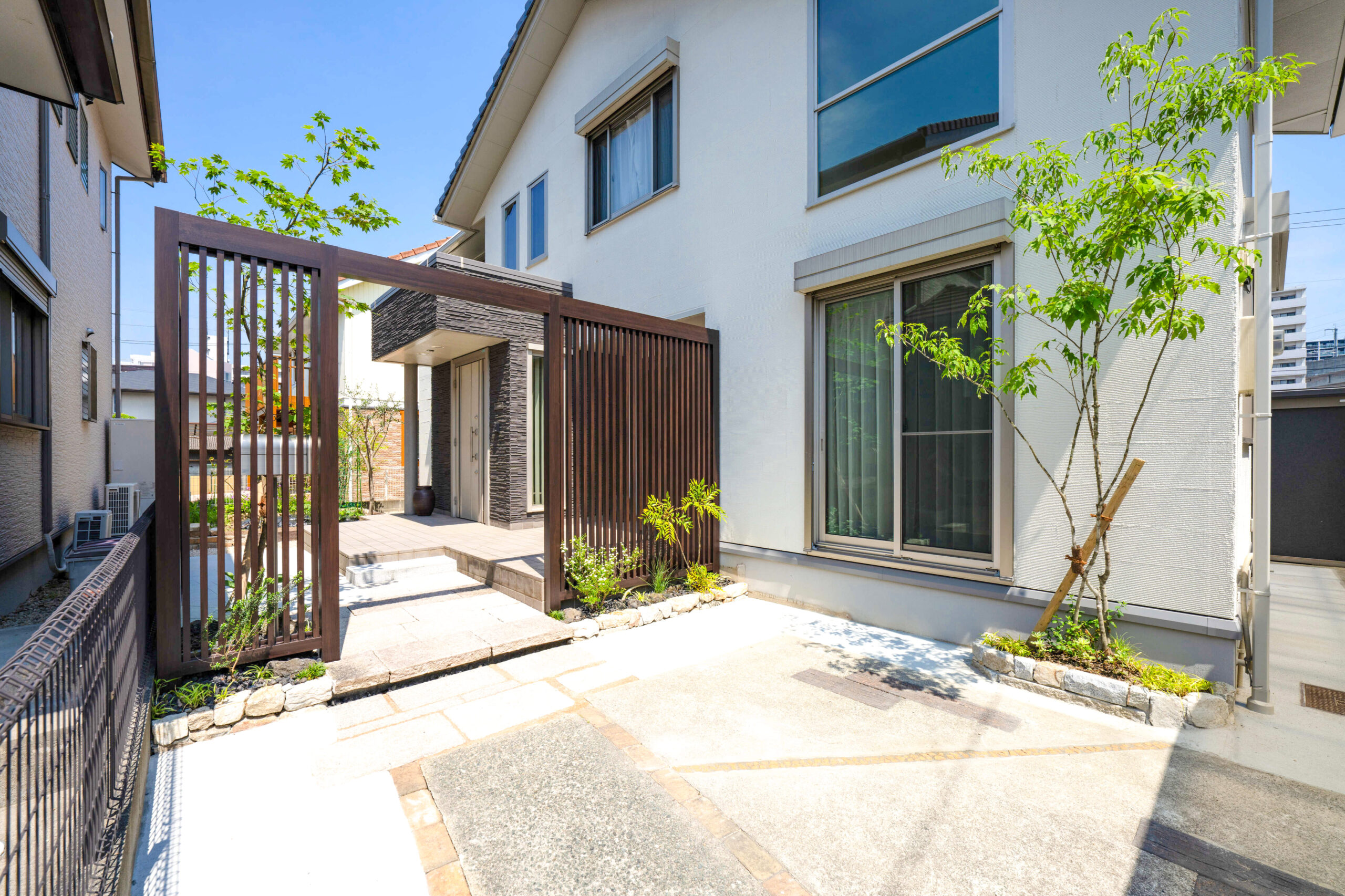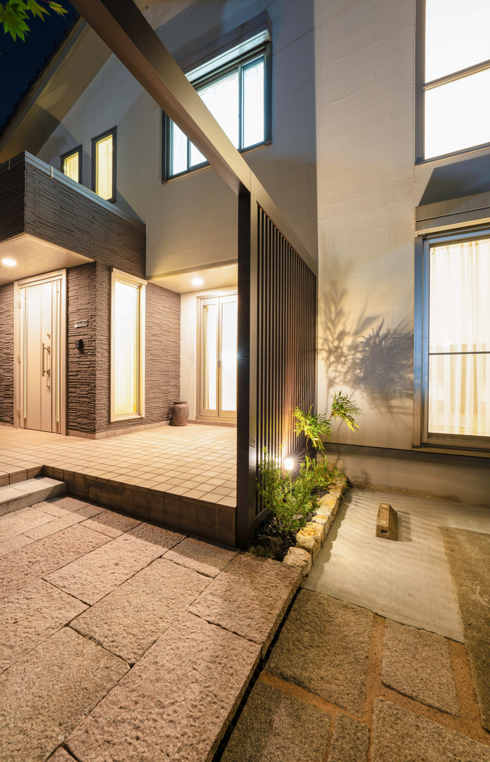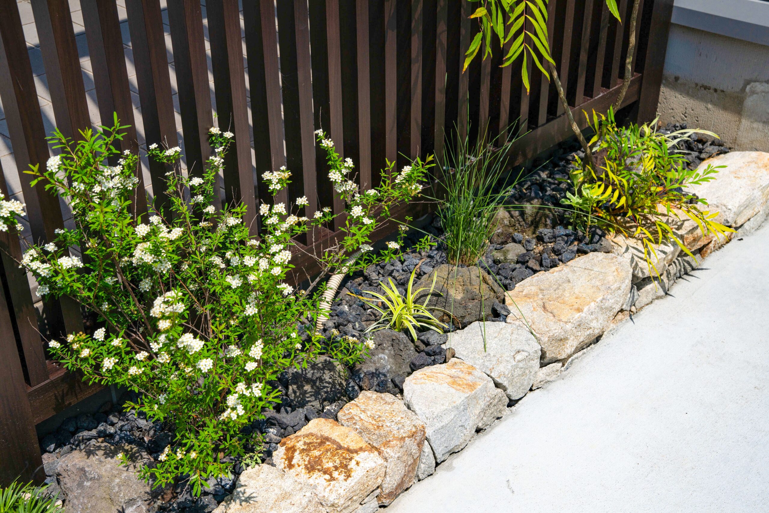 リフォームをご依頼いただき、なるべく現状ある素材を再利用できたらとの要望。 アプローチに使用の御影石は、元々裏の勝手口やアプローチ使ってあり、一部足りない箇所は、古い商品を現状に合わせるように加工。土留めの花壇や石積に関しては、地元の石を使いなるべく自然な色味に揃えながら石積を行いました。