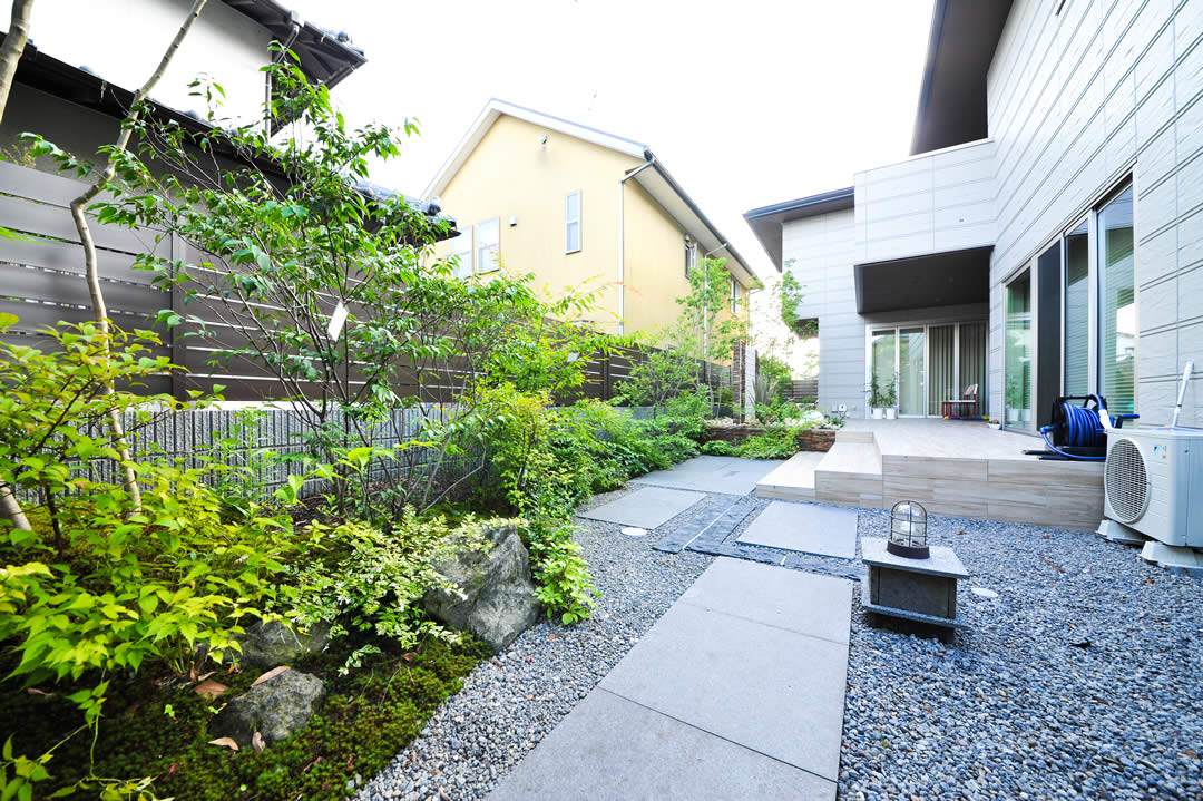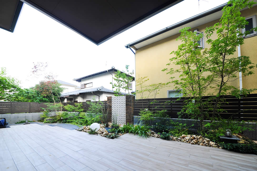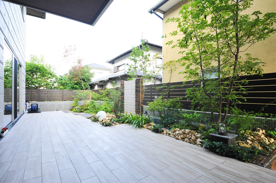 「静寂」「癒し」をテーマにしています。タイルテラスを中心に休日の午後をゆっくり過ごす為の空間をデザイン、施工しました。
