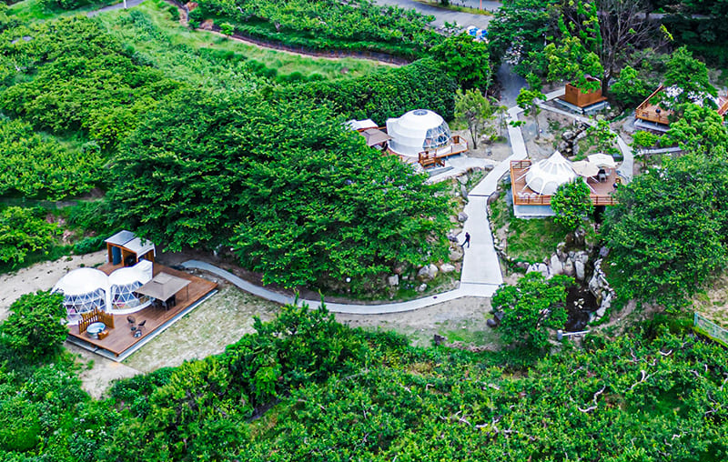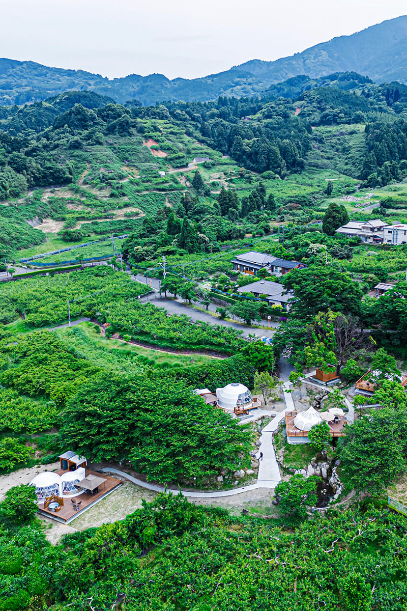 公園の一部に誕生したグランピング施設。森に包まれるアプローチの動線を意識し、人々と自然をつないでくれる空間をイメージし設計。