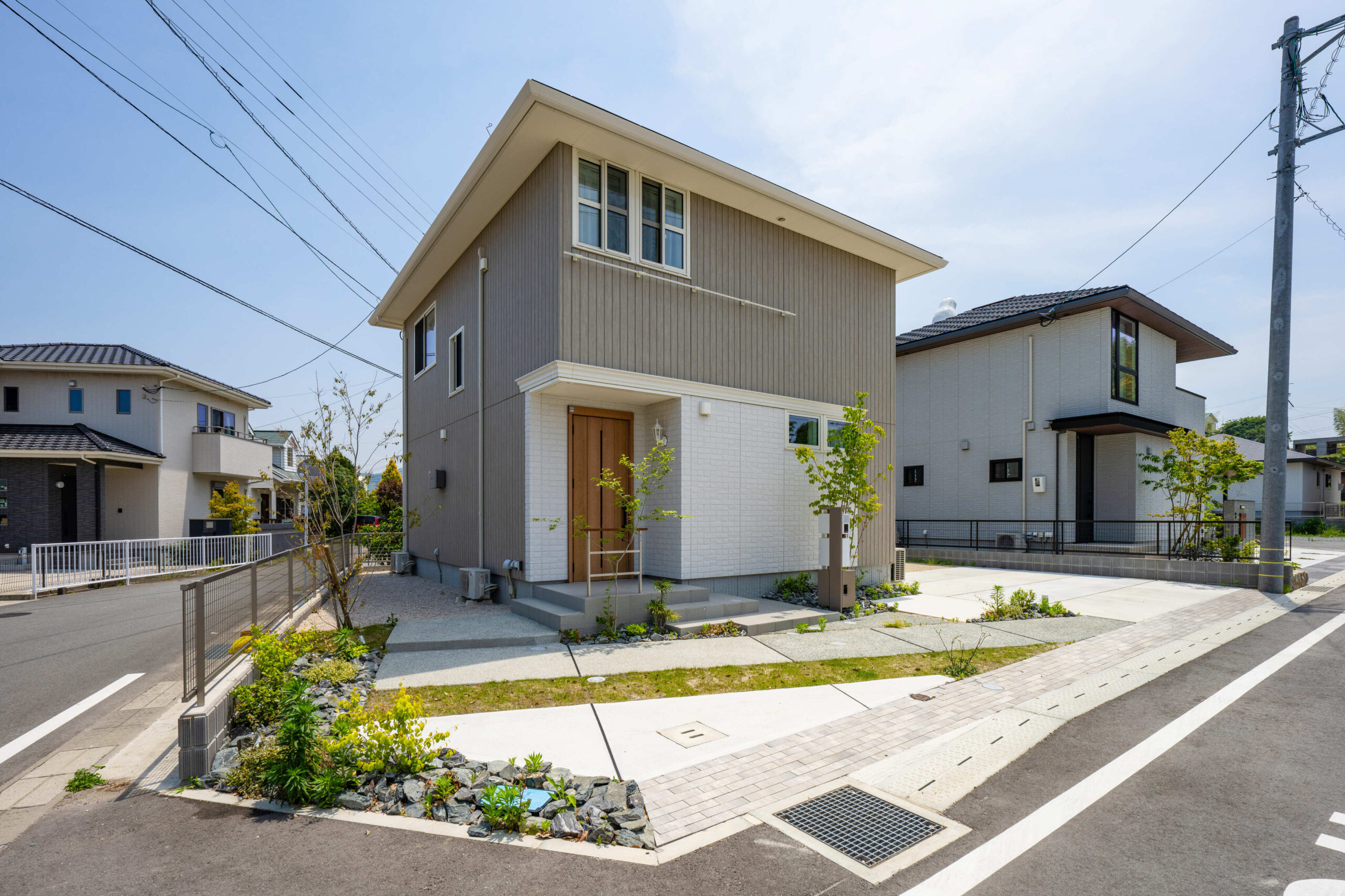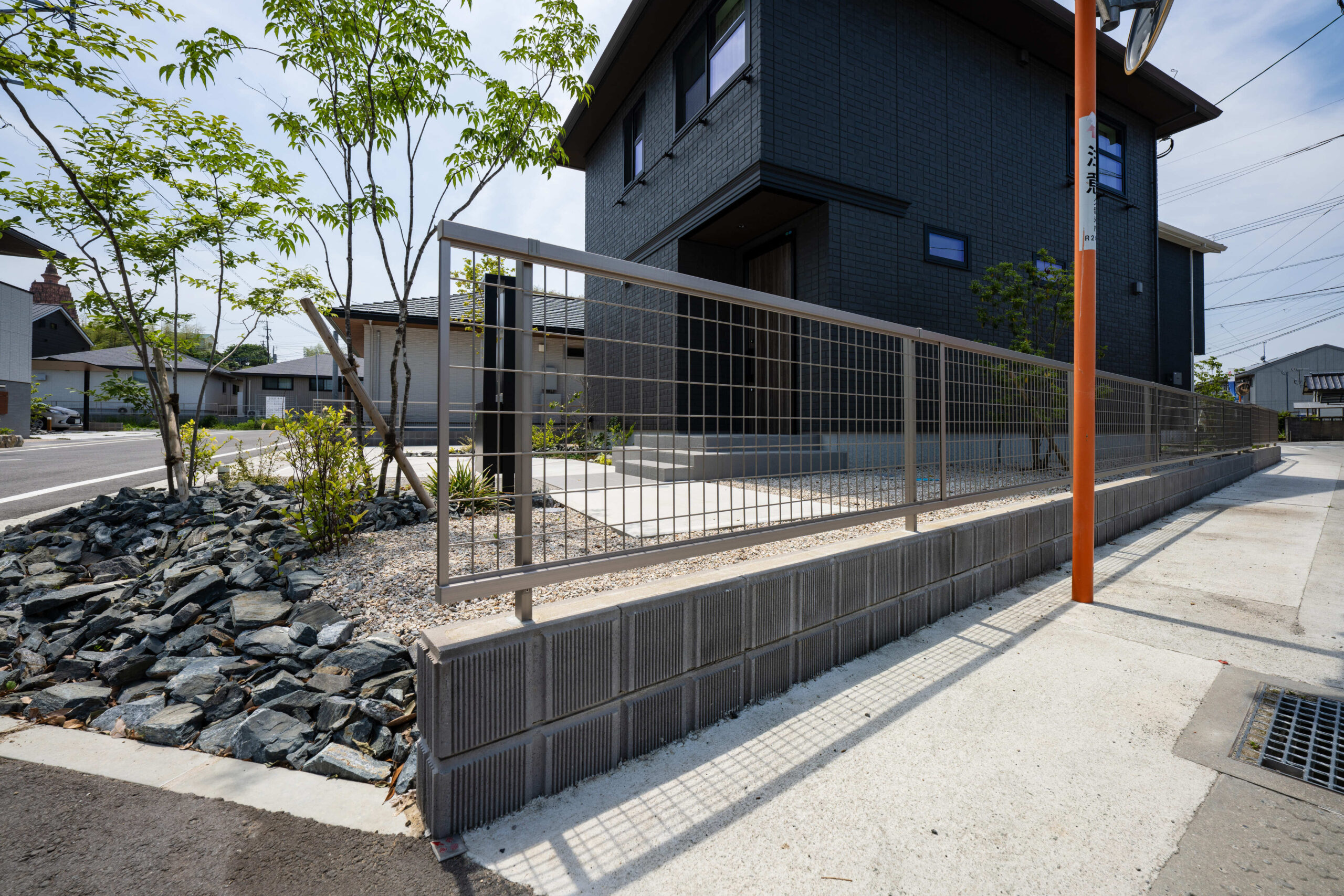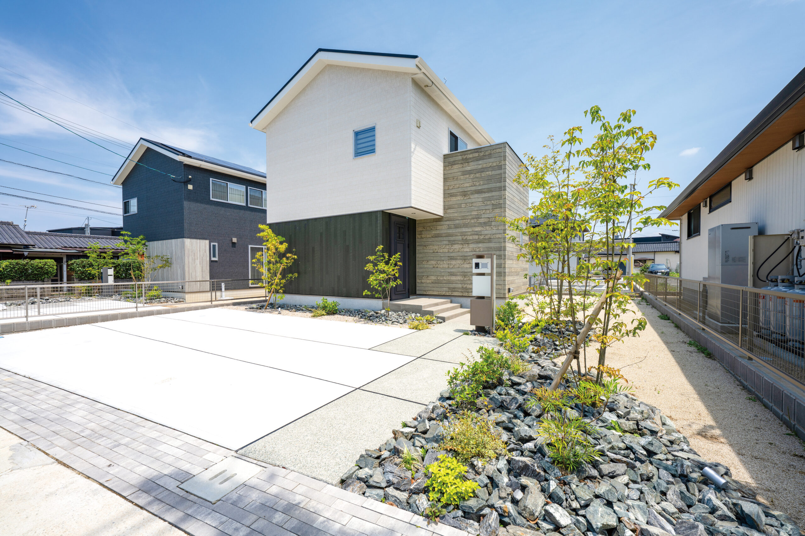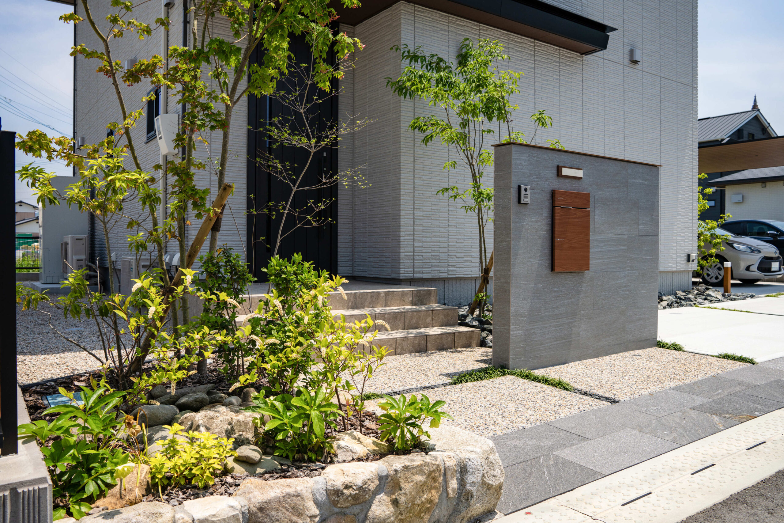 岩や石を多様するロックガーデンに緑をバランス良く配置し、明るい空間を演出した分譲地。 植栽や石積みの花壇や洗い出しにこだわった庭や、カーポート、機能門柱、フェンスの取り付けなど、それぞれのお客様のご要望に寄り添いご提案し、施工しました。