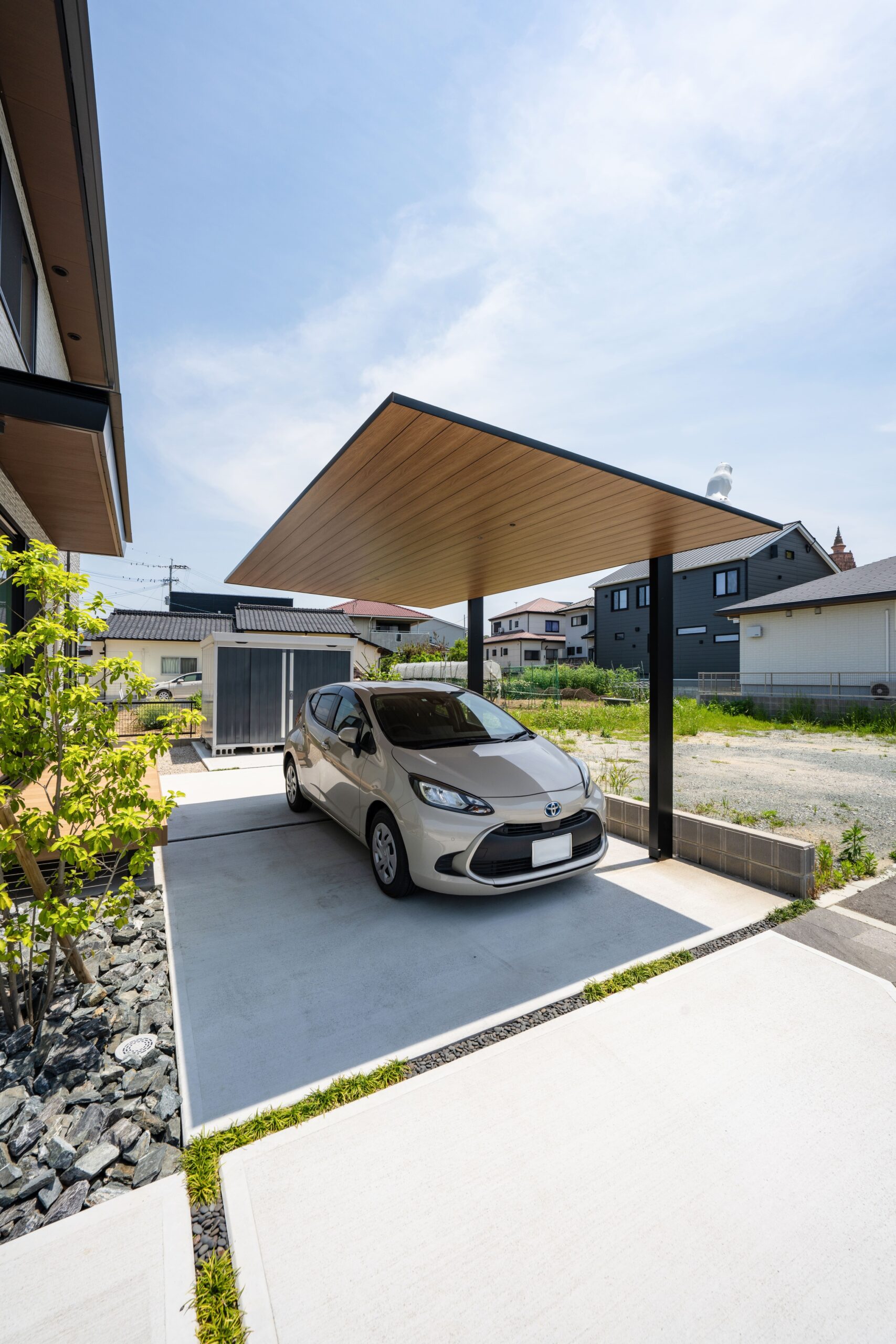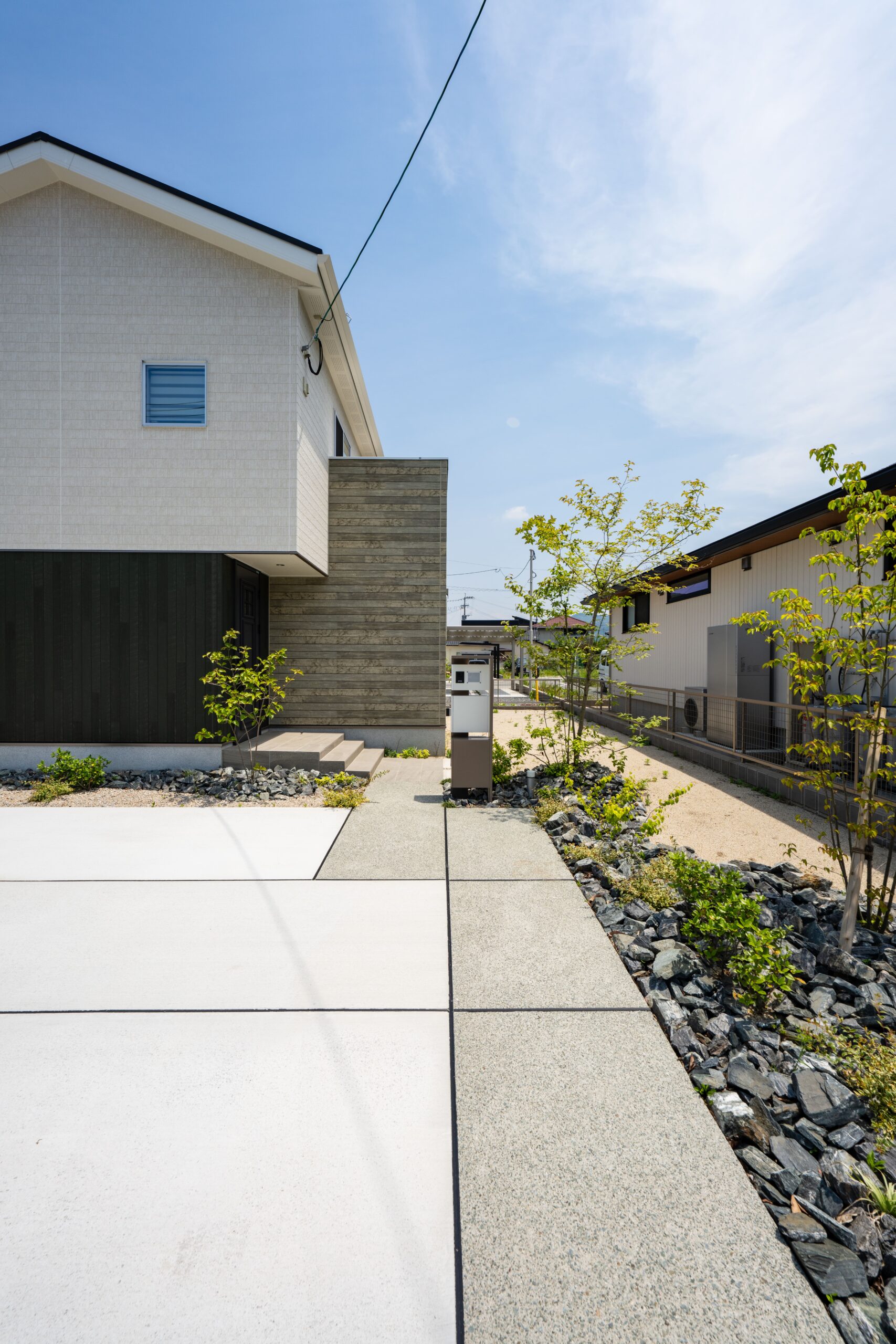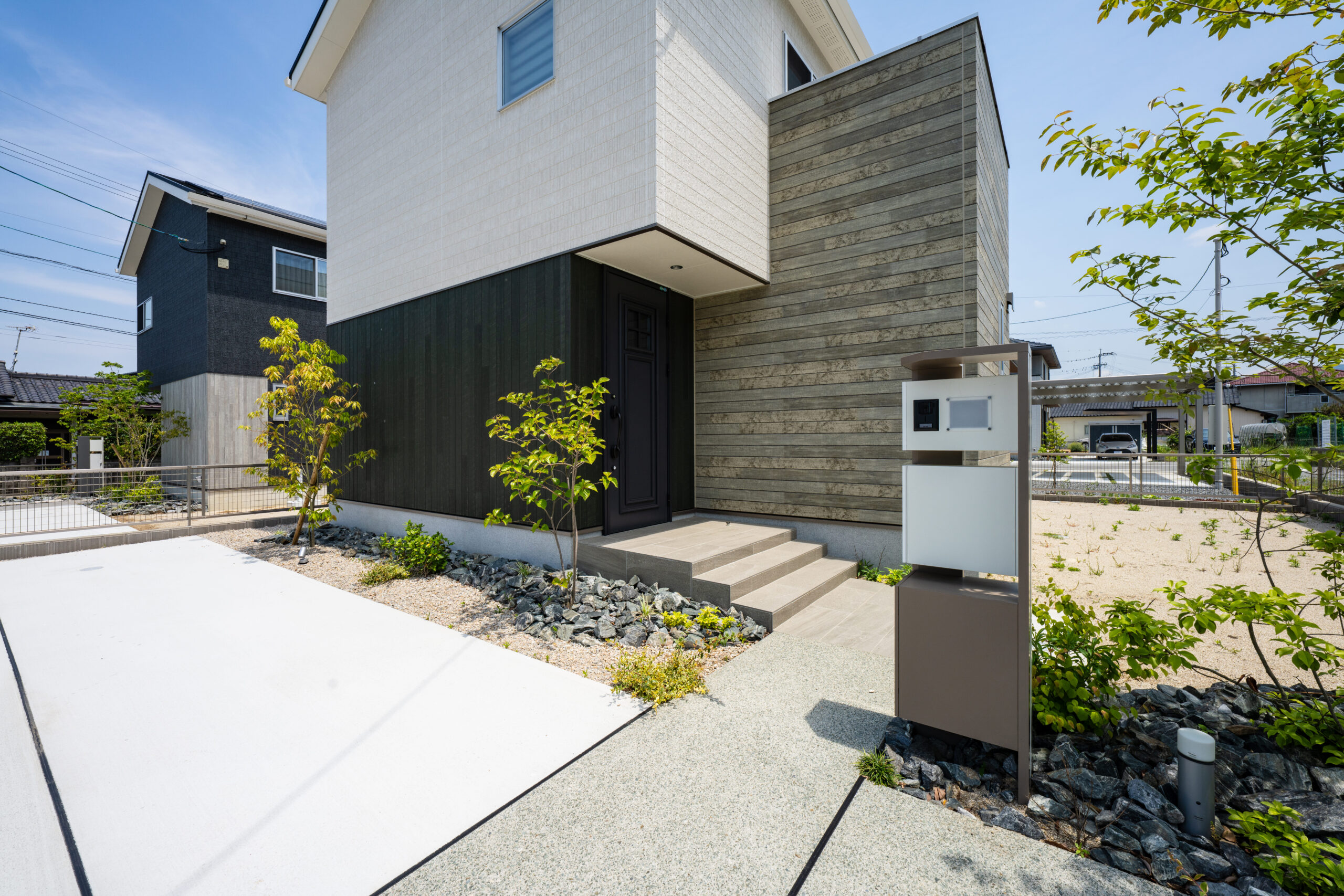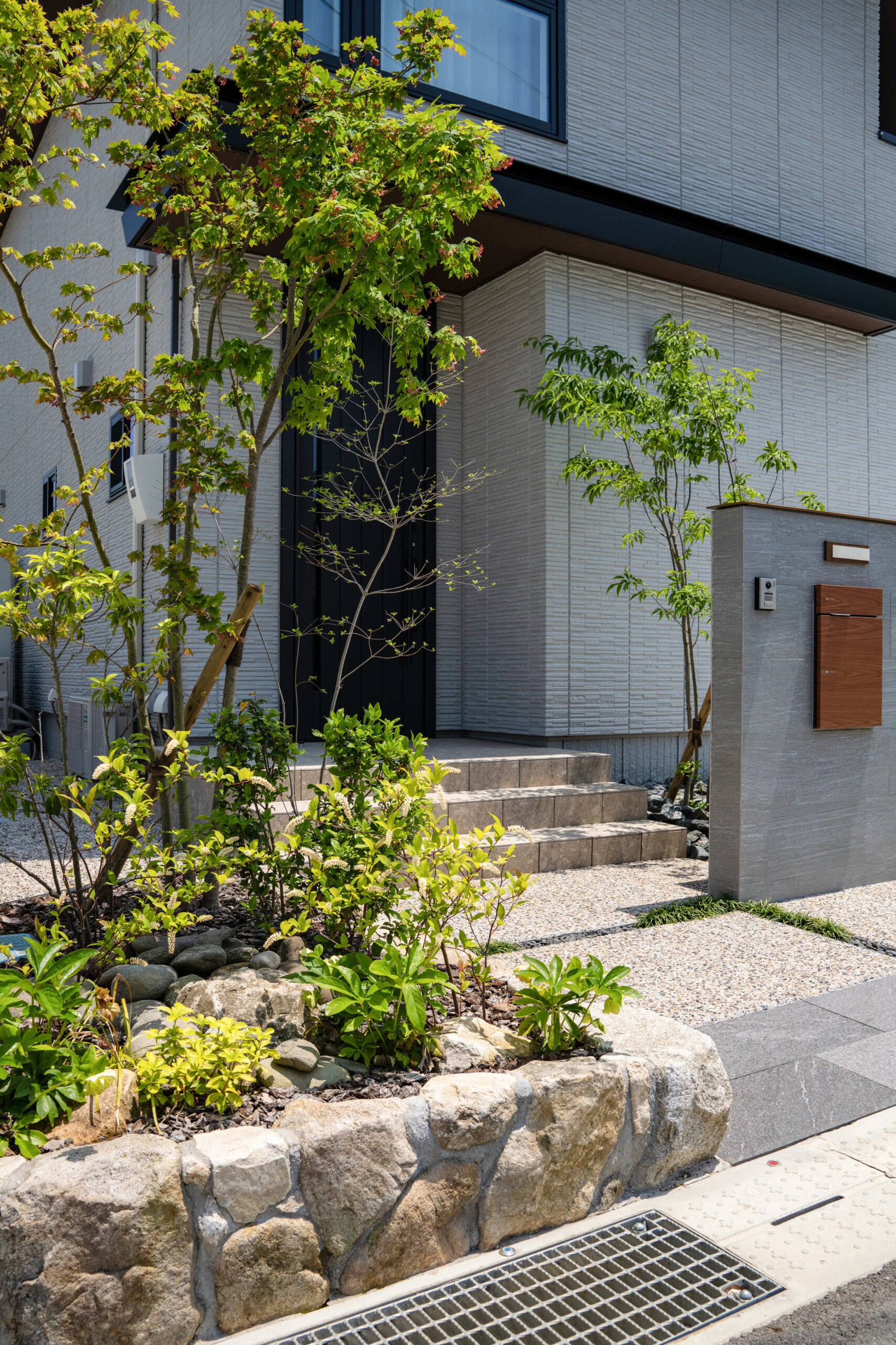 岩や石を多様するロックガーデンに緑をバランス良く配置し、明るい空間を演出した分譲地。 植栽や石積みの花壇や洗い出しにこだわった庭や、カーポート、機能門柱、フェンスの取り付けなど、それぞれのお客様のご要望に寄り添いご提案し、施工しました。