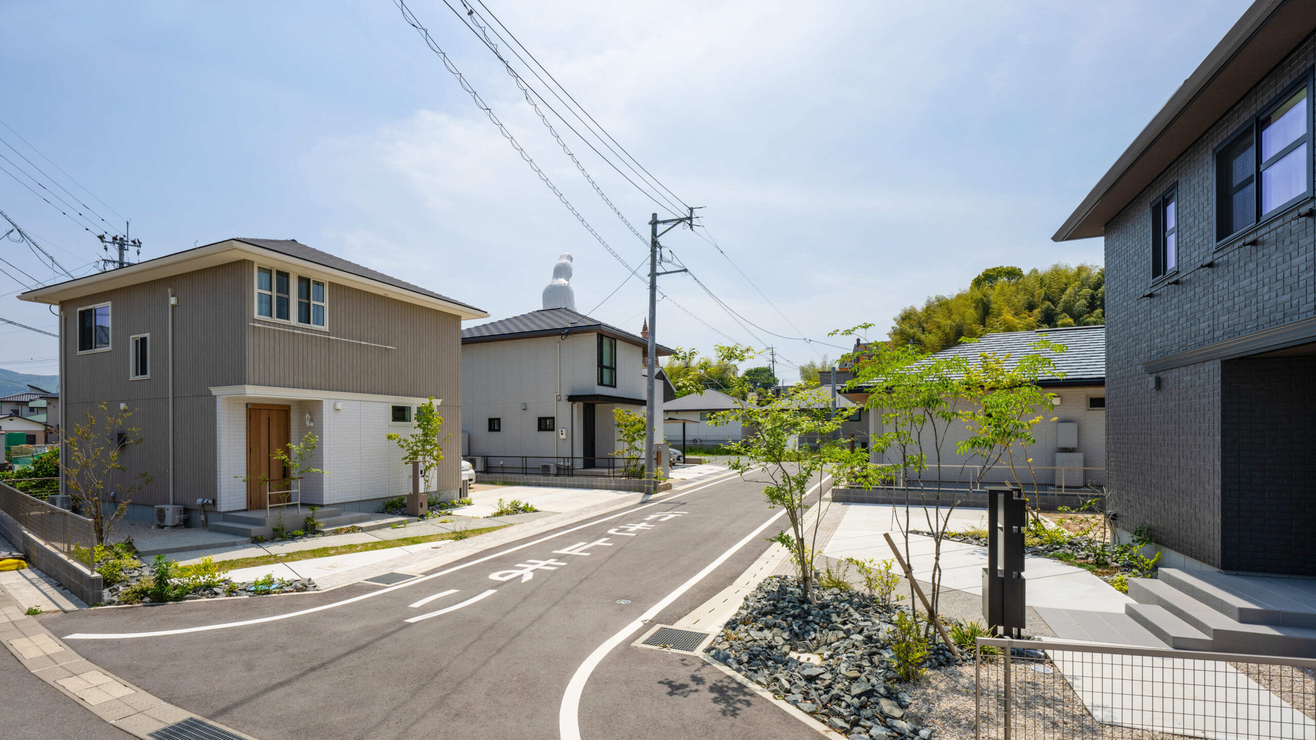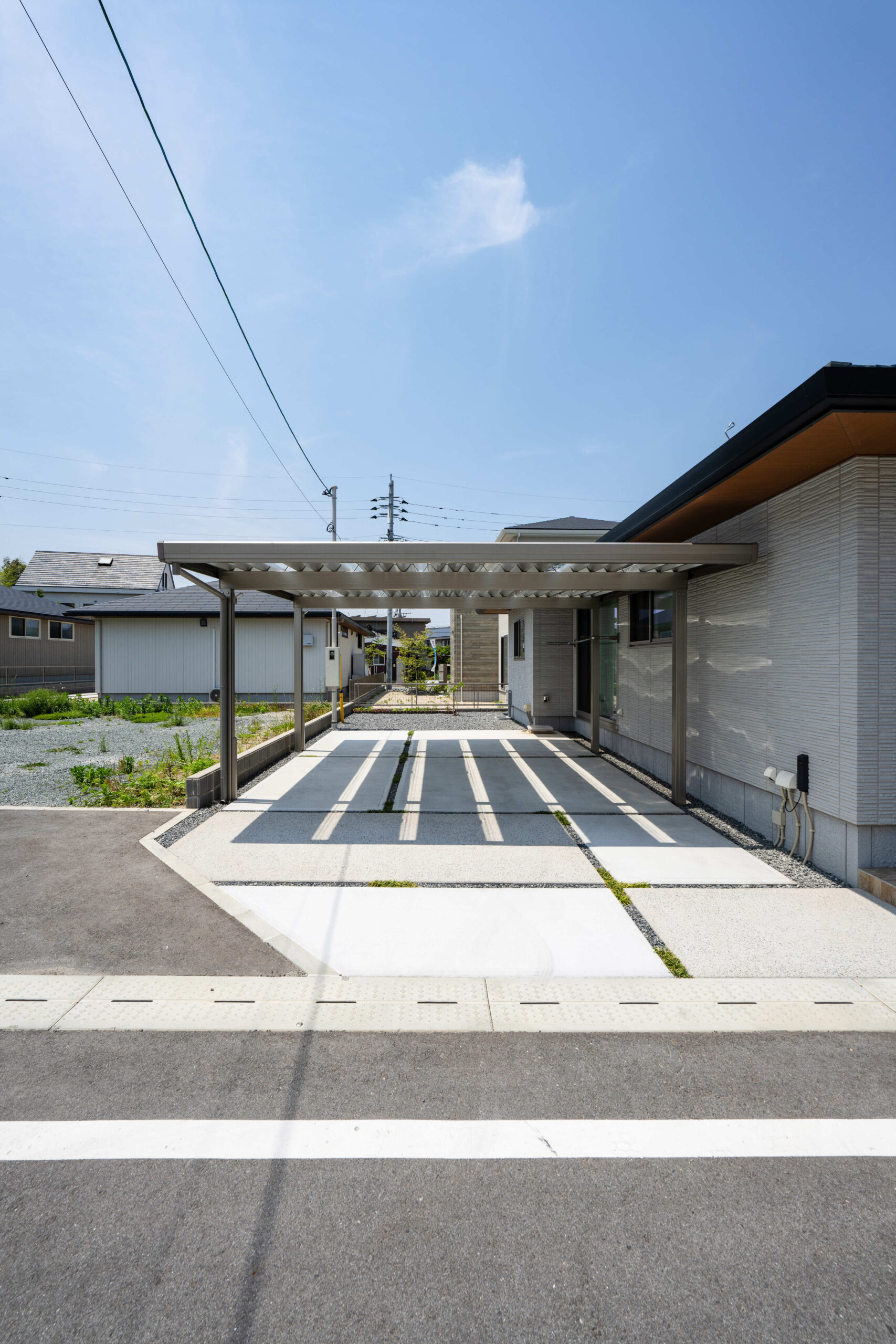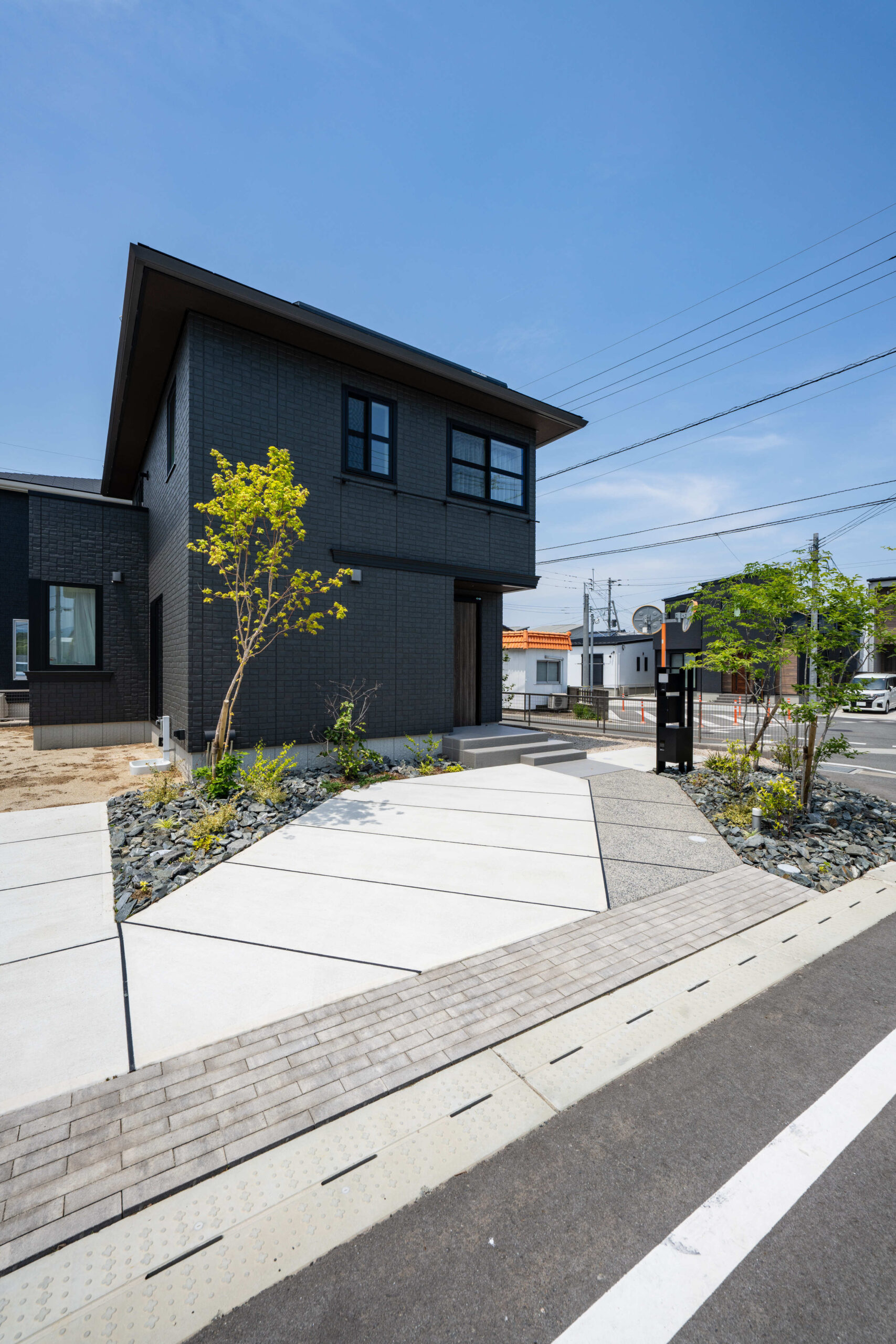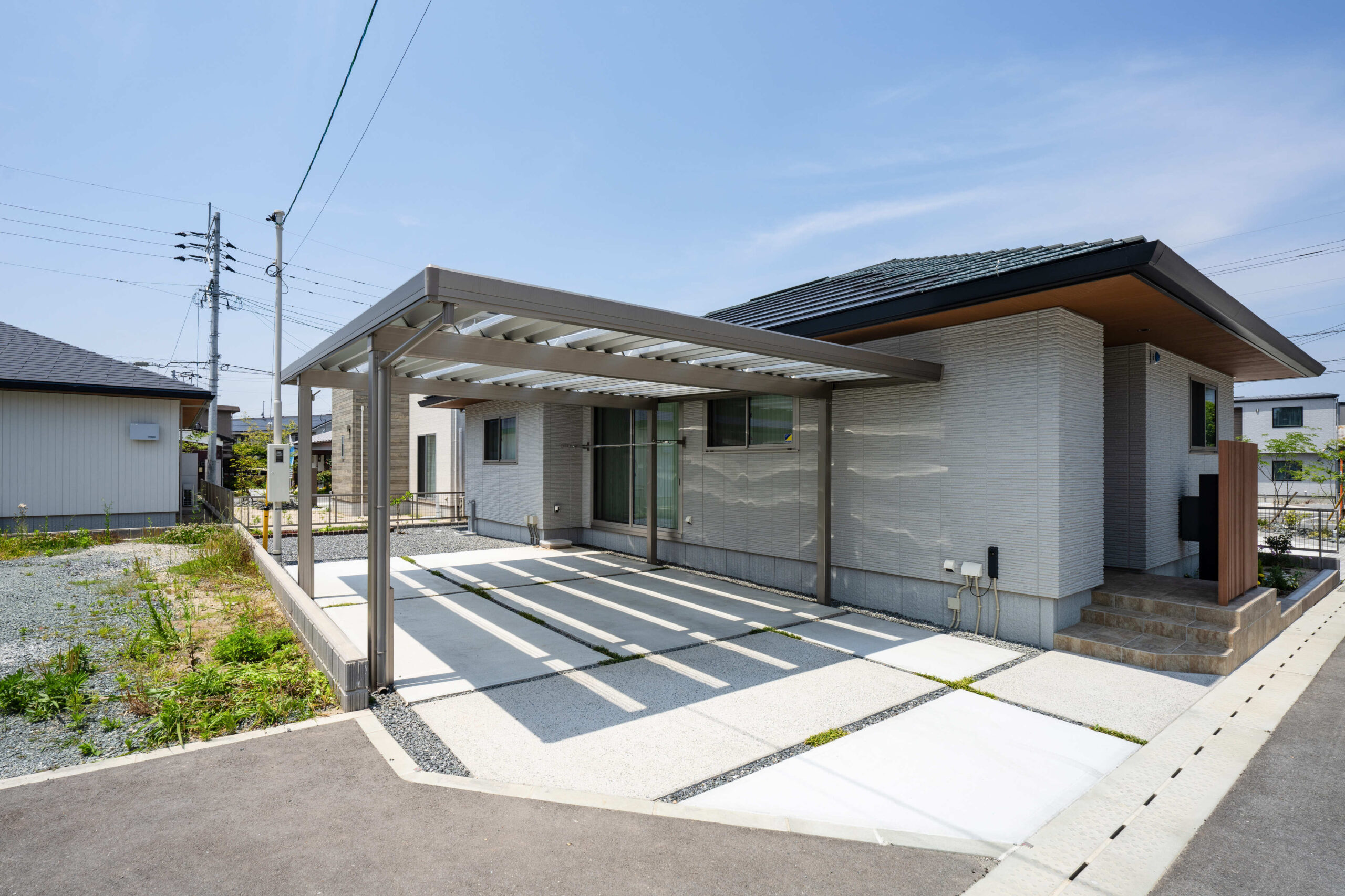 岩や石を多様するロックガーデンに緑をバランス良く配置し、明るい空間を演出した分譲地。 植栽や石積みの花壇や洗い出しにこだわった庭や、カーポート、機能門柱、フェンスの取り付けなど、それぞれのお客様のご要望に寄り添いご提案し、施工しました。